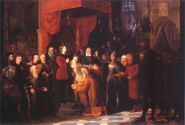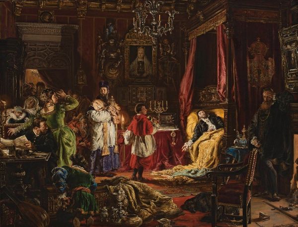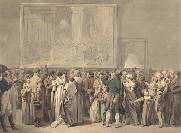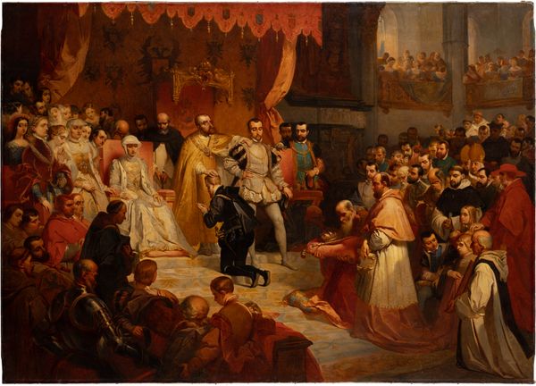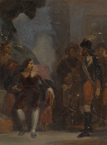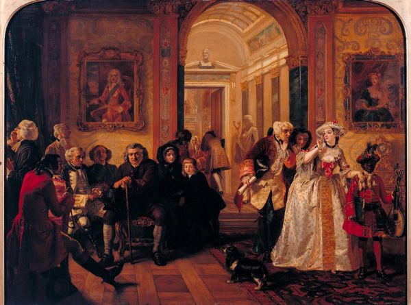 David Roberts painted this view of an interview with the Viceroy of Egypt within a palace, capturing a moment rich with cultural and political implications. Notice the gathering of figures arranged in a formal setting, dominated by the opulence of the palace interior. This is not merely a depiction of an event, but a carefully constructed composition of power and diplomacy. Consider the symbol of the red curtain, a motif which has draped the stage for countless encounters of authority throughout history. From royal audiences to theatrical dramas, the color red elicits themes of power, passion, and spectacle. We find echoes of this staged authority in Renaissance portraiture and even ancient Roman depictions of emperors. The gesture of presentation, seen here in the figure handing papers, is a visual echo of offerings to deities or rulers. This reveals how gestures and symbols carry cultural weight, connecting us to a deeper, shared history. The scene is imbued with a psychological tension—a silent negotiation playing out in the expressions and postures of those present. It calls forth our understanding of such encounters, engaging us in this historical, cultural, and psychological narrative.