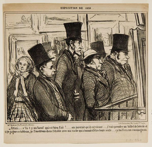 Editor: We're looking at Honoré Daumier's "Cristi... v'la-t-y un boeuf qui est bien fait!...", a print drawing from 1859. It looks like a group of people viewing art; their faces seem rather… judgmental, almost. What do you see in this piece? Curator: My attention is immediately drawn to the artist's strategic use of line. Observe how Daumier varies the density and direction of hatching to model form and differentiate textures. Notice, for instance, the contrast between the smooth surfaces of the top hats and the more intricately rendered clothing. Editor: The hats really do stand out. Are they meant to create a sort of visual rhythm? Curator: Precisely! Consider the repetition of the top hat motif and how it guides the viewer's eye across the composition. But consider how each face under those hats still receives individualized treatment; the angle and light on each face make us question what exactly Daumier's commentary is about this class of people, whether their interests are the art itself or something more transactional, concerning class. Editor: That's a good point. The range of expressions is quite varied, despite their shared social status as evidenced by their hats and coats. Curator: Absolutely. And reflect on how the artist has carefully constructed a dynamic interplay between positive and negative space. Do you note how the lighter areas accentuate the darker contours, creating a sense of depth and volume? The interplay with each face allows it to retain unique visual weight. Editor: It’s all so intentional and meticulously crafted! I see the nuances in how the light interacts with each unique figure in the print. Curator: Indeed. By focusing on these formal elements, we gain a richer appreciation for Daumier's artistry. Editor: This really helps see past just the surface of what they are observing, and lets you delve into the craft. Thank you!