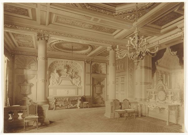 Curator: Here we have a photograph titled "Interieur van het Paleis van Fontainebleau," dating from around 1875 to 1900. It's attributed to Mèdèric Mieusement. Editor: My first thought is it’s quite subdued. There's an almost sepia quality. What stands out, though, is this intense layering of detail – the chandeliers, the carved mantelpiece. Curator: Indeed. Mieusement masterfully captures the opulent interior through photography, a medium then gaining prominence. The symmetrical composition draws the eye into the receding space, accentuating the palace's grandeur. Consider the tonal gradations. How do they influence the viewer's perception of volume and light? Editor: I’m thinking, the muted tones give it an almost dreamlike quality, right? I find it oddly melancholy, as though we are intruding upon a scene from the past. The architecture feels more lively than one might expect given its scale – as if the walls are breathing. But where are the people? Does that emptiness say something? Curator: A brilliant observation. The absence of human figures is a conscious choice, directing our focus towards the setting itself – it becomes a stage absent the actors. The textures within the image are quite suggestive; imagine feeling the cold marble under your hand. Editor: And yet, even if the room is empty of people, the space pulses with stories, each carved flourish holding memories and secrets. How differently would we experience the room were we to see figures in conversation? It's intriguing to reflect on this captured silence. Curator: Absolutely. We see how photography can not simply record a space but also offer an interpretation. The rigid lines that define classicism become imbued with personality. It makes me wonder if Mieusement had specific stories of his own he meant to share. Editor: Yes! Seeing this photograph makes one feel very aware of what it chooses to reveal as much as conceal, right? Curator: Well, thinking about this now, that certainly alters my perception. Thanks for pointing me towards those quiet currents humming beneath the image. Editor: Likewise, I appreciate your astute breakdown of its formal qualities – food for thought!