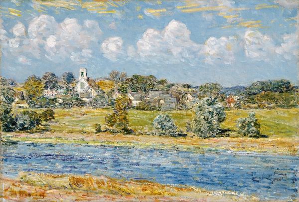 Willard Metcalf made this landscape painting, "The Breath of Autumn," probably in the early 20th century, using oil paint on canvas. You can see how the brushstrokes build up the scene, like he's layering colors to capture a feeling, not just a picture. Look closely, and you'll notice how Metcalf uses these tiny touches of paint, almost like dabs, to create the texture of the field in the foreground, it’s like he's trying to catch the light as it flickers through the plants. And then, there's this soft, hazy blue of the water, which is contrasted by the brighter green, and gold of the plants in the foreground. The way the colors play together, it's like a visual echo of how autumn feels, you know, that mix of warmth and coolness. Metcalf reminds me of other impressionist landscape painters like Pissarro, who were all trying to find a way to paint the light and atmosphere as much as the things themselves. It’s like they were figuring out how to make a painting that feels more real than a photograph.