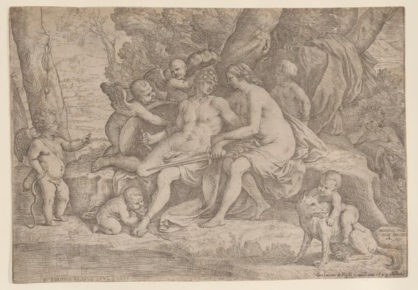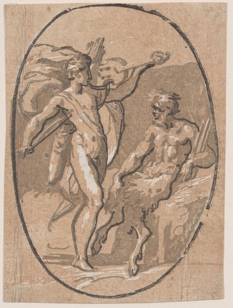 Editor: Here we have "The Judgement of Paris," a drawing in ink by Hans Rottenhammer, created sometime between 1564 and 1625. The figures are arranged within a circular frame. I'm struck by the contrast between the muscular, seated figure on the left and the softer, more feminine figures in the center. What can you tell me about it? Curator: The "Judgement of Paris" is a recurring subject. The seated figure is Paris himself, being asked to judge which of the three goddesses is the fairest: Hera, Athena, or Aphrodite. The subject explores themes of beauty, rivalry, and consequence. In your initial reaction, you perceived a contrast in musculature—what does that contrast suggest to you symbolically? Editor: Perhaps it reflects a cultural idea about the roles or nature of men versus women. Is the story of Paris especially significant to this time period? Curator: Yes, absolutely. During the Renaissance and Baroque periods, classical mythology provided a rich source of allegorical and moralizing narratives. The tale served as a warning against vanity and hubris, especially among rulers. How might the *act* of judgement be seen here? Is Paris, for example, depicted with authority, perhaps with doubt? Editor: He looks a bit hesitant, actually. It looks like his arm extends to give an orb or fruit to the goddesses? This story must have offered ways to comment on contemporary power dynamics. Curator: Exactly. Rottenhammer uses this well-worn tale to delve into universal questions about power, beauty, and choice. Each goddess represents certain qualities; wisdom, power, and beauty, of course. By examining how he portrays these figures, we can see how societal values are encoded within the artwork. What are you left pondering now? Editor: How relevant classical themes stay through the centuries! And, how artists can use myth to discuss their present moment. Curator: Precisely! A powerful reminder of art’s ability to reflect and shape our understanding of the world.