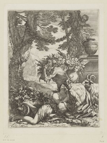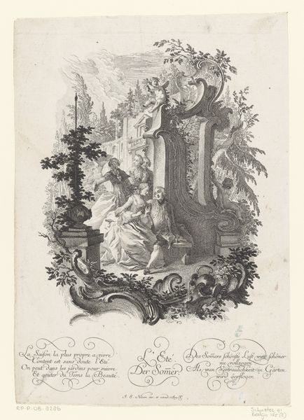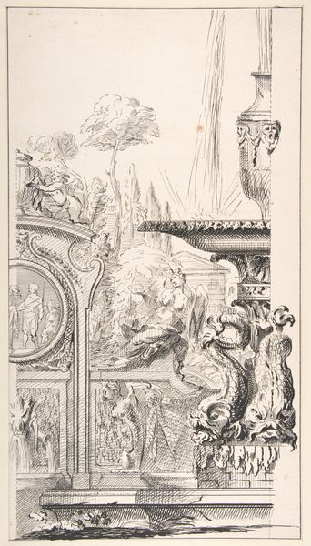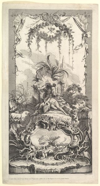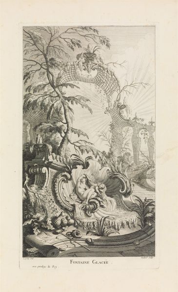 Johann Georg Hertel created this delicate frontispiece for a book of cartouches with etching. The image presents a symmetrical structure, with a balance between the classical architectural elements on the left and the organic, natural forms on the right. The composition invites us to consider the interplay between artifice and nature. Notice how Hertel uses line and shadow to create depth, guiding our eyes through the image. The figures, rendered with meticulous detail, sit atop pedestals, acting as focal points within this constructed landscape. This elevation suggests a hierarchy, drawing attention to their symbolic significance. One might ask, what does the structure of the composition, its combination of architectural and natural elements, and the arrangement of its figures, tell us about the values and beliefs of the time? It’s a testament to the era's fascination with order and its engagement with philosophical ideas about the relationship between humanity and the world. Through such formal arrangements, Hertel offers a glimpse into the intellectual landscape of his time.