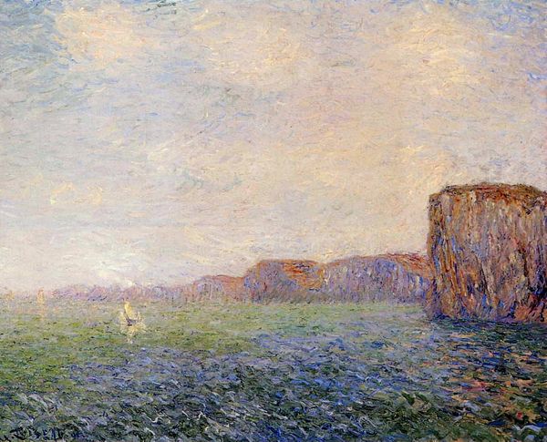 Curator: Standing before us is Alexis Jean Fournier's "Chateau Gaillard," dating from around 1913. This work, currently held in the Minneapolis Institute of Art, exemplifies impressionistic landscape painting. Editor: It feels very…airy. Almost weightless. The colors are soft, almost pastel, and that castle melts right into the hillside. There's something very gentle about it. Curator: Indeed. The brushwork is characteristically impressionistic – loose and broken, focusing on capturing the transient effects of light and atmosphere. We can clearly see how Fournier applied plein-air techniques to compose it. Editor: Look at that! So much white paint. And thick impasto. The way it catches the light gives such a tangible sense of material presence. One can imagine the artist contending with wind and sun, recording both a landscape and his sensory experience of the elements. Did you notice the small herd of sheep at the bottom right of the composition? The association with pasture and wool processing feels especially meaningful here. Curator: The sheep function more as repoussoir—visual devices directing the eye back toward the distant focal point of the ruined chateau. This use of recessive depth to establish spatial relations shows Fournier's concern with pictorial organization and structure. Editor: Structure? Perhaps. But beyond formal analysis, it is critical to reflect upon how landscapes become deeply ingrained with political meanings. Fields become agricultural factories. And in this case, the labor implied in their management goes entirely unseen. It's easy to overlook the role of agricultural production in this bucolic scene. Curator: Granted. But from my perspective, it presents us with a rather skillful application of light and perspective. The use of the color palette and brushwork, so subtle in tone and touch, works cohesively to pull the disparate elements of its composition together into a harmonious vision. Editor: Harmony isn’t the word I'd use—there's an anxious transience to how it portrays time. Even those soft colors—those muted greens—they register not tranquility but constant, ongoing processes of change: the work required to keep an idyll idylling. Curator: An interesting reflection. Fournier's engagement with landscape reminds us that, at its core, it invites subjective interpretation. Editor: Indeed. Whether looking at material transformation, labor processes, or impressionistic brushstrokes, art prompts engagement, questions, and hopefully, dialogue, wherever we find ourselves situated in relation to its making and display.