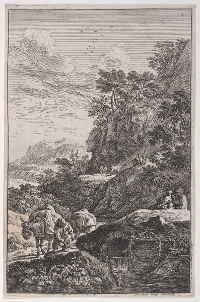 Gillis Peeters the Elder made this print, "Jupiter en Callisto," sometime in the mid-17th century, using etching. This printmaking process involves coating a metal plate with a waxy, acid-resistant substance, drawing the design, and then immersing the plate in acid, which bites into the exposed lines. The magic of etching lies in the artist's hand and control over the acid. Varying the depth and width of lines gives the print its tonal range. See how the subtle shading creates the depth and texture of the landscape, from the foreground rocks to the distant hills. This attention to detail and the labor-intensive process contrast sharply with our modern age of digital reproduction. The finished print, like this one, would have circulated widely, bringing art to a broader audience than ever before. So, thinking about the materials, making, and social context, we can see how this etching embodies a pivotal moment in art history, democratizing access to images through the skilled manipulation of metal, acid, and ink.