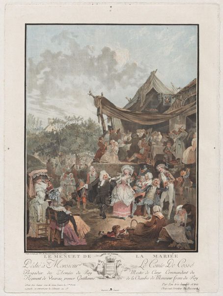 Louis Philibert Debucourt created this print, "Le Menuet de la Mariée," using etching and aquatint. It offers a glimpse into the social rituals and hierarchies of late 18th-century France. The image depicts a wedding celebration, likely among the aristocracy, given the subjects' elaborate attire and the presence of what appears to be a nobleman. The minuet, a formal dance, serves as a central motif, symbolizing the structured social interactions of the time. The setting, possibly a country estate, further emphasizes the divide between the privileged class and the peasantry. Made during a period of growing social and political unrest in France, the print invites questions about the role of art in reflecting or challenging existing social norms. Does it celebrate the opulence of the aristocracy, or does it subtly critique their detachment from the realities of everyday life? Historians of art and culture draw upon a range of sources, including contemporary accounts, fashion studies, and social histories, to contextualize such images. By doing so, we can better understand how art both shapes and reflects the society in which it is created.