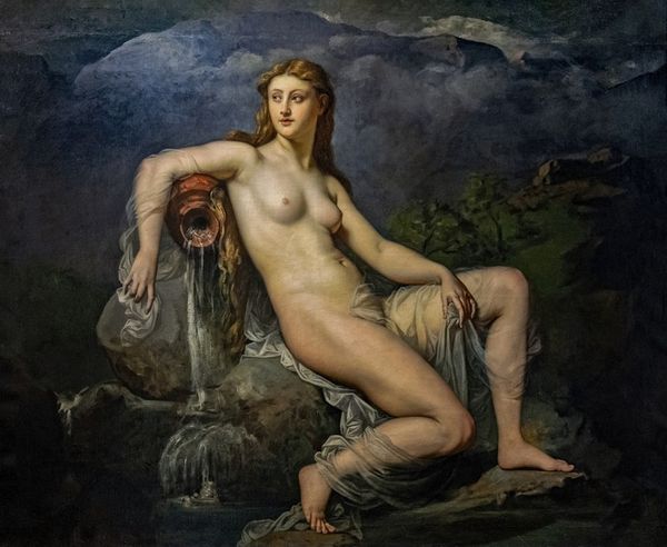 Curator: Immediately striking, isn't it? Hans Makart’s "The Death of Cleopatra" from 1875. Editor: The drama is certainly dialled up. A feast for the senses. So lush, so theatrical… but is it genuinely moving, or just manipulative? Curator: Makart’s Orientalism infuses this with loaded symbolism. Look at the snakes. Beyond obvious phallic interpretations, the asp connects to ancient Egyptian concepts of royalty and immortality, reborn through venom. See how one caresses her breast, a slow burning agony replacing the source of life? Editor: The public of the time must have felt quite provoked! Her death, historically a political act, becomes almost pornographic under this artistic choice. Cleopatra becomes less of a ruler, more of an object on display. The painting itself almost stages the end of an era, doesn't it? A changing political scene reflected on canvas. Curator: Yes, it's tempting to see that artistic license as exploitative, but it's equally interesting to view the death as something that would free her and return her soul to divinity, an acceptance. Note the details, jewelry, floral embellishments. Each signifies wealth and luxury. Editor: Makart certainly understood spectacle and the politics surrounding his artwork's display. One can see "The Death of Cleopatra" fitting into a larger narrative around women in power, and how society often chose to tear them down by sexualising or demonising them through cultural mediums. It echoes similar treatments throughout centuries. Curator: The Romantic style is perfect for layering and emphasizing the nuances in meaning. Look how it affects emotional expression with its vivid colors and textures! Editor: Absolutely, this historical painting does raise important considerations, about its position in art history but also its interpretation in popular culture. The gaze has power, after all. Curator: And perhaps by understanding those elements, we take a measure of that power for ourselves. Editor: I believe you are right. Thank you, I had not looked at it that way before!