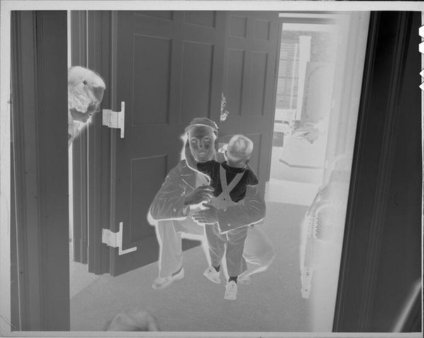 Editor: This is an untitled photograph of a family in their living room, taken by Lucian and Mary Brown. It's a small print, only about 4x5 inches. The high contrast and the composition of the image feel very formal and staged. What do you see in this work? Curator: The image presents a study of contrasts: the rigidity of the composition versus the casual pose of the man, the stark tonality against the intricate floral pattern of the couch. Note how the subjects are arranged almost as geometric shapes within the frame. The texture of the photographic paper itself is another key element. Editor: So it's more about the relationships between the shapes and tones than what’s actually depicted? Curator: Precisely. Consider how the negative space around the figures contributes to the overall tension. The formal qualities suggest a deeper symbolic reading, perhaps about societal roles and representations. Editor: I never thought about it that way. It gives me a new perspective.
