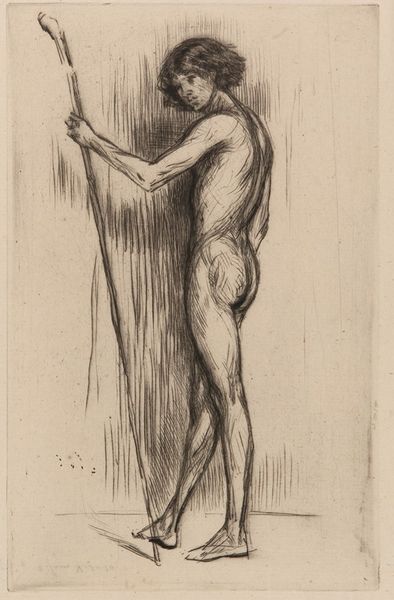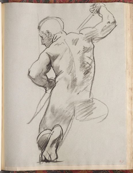 Editor: This is John Singer Sargent's "Study for Second Angel from Left, 'Israel and the Law,'" part of a larger project for the Boston Public Library. It's a powerful charcoal sketch. What symbols do you see at play here? Curator: The angel figure, even in this study, embodies strength and perhaps a burdened responsibility. Notice the tension in the back muscles and the downward gaze. How might this resonate with the concept of "law" in different cultures? Editor: Law can be viewed as restrictive. Is Sargent perhaps suggesting a heavy burden? Curator: Perhaps. Consider also the angel as a messenger or intermediary. What is the cultural memory of angels carrying heavy burdens of divine law and judgment? This image hints at a complex weight. Editor: I never thought of angels in such a burdened way. Thanks for that perspective.