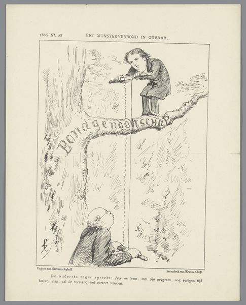 Curator: This rather whimsical drawing and print by Johan Michaël Schmidt Crans is titled "Spotprent over het letterkundig tractaat met Duitsland, 1885," which translates to "Cartoon about the literary treaty with Germany, 1885." It’s crafted with ink on paper. Editor: It’s stark and humorous. The linear hatching creates a scene of satirical commentary. The contrast seems almost exaggerated, highlighting a distinct division, doesn't it? Curator: Indeed. As a caricature, it aims to convey a pointed message. It’s more than just a comical image; it's a reflection of cultural anxieties and political dynamics between the Netherlands and Germany at the time. Editor: The figure in the tree holds what seems to be a sign marked with the letters "LT N-D." Below him, a fox reaches up expectantly. There’s an element of fable here, of some deception perhaps? Curator: Absolutely. The inclusion of text, notably a reference to “De vos en de rock,” a take on "The Fox and the Rock" alludes to underlying currents of perceived betrayal or strategic manoeuvring in these dealings. The image can be interpreted as a commentary on Dutch apprehensions regarding the encroachment of German cultural influence. The treaty negotiations likely stoked concerns about cultural identity and autonomy, rendered tangible by the cartoonish narrative elements and their immediate accessibility. Editor: It’s intriguing how the artist uses folklore. By referencing a fable, he imbues the scene with a moral dimension, transforming political commentary into a more universally accessible narrative. It’s not merely about politics, it’s about deeper symbolic resonance and cultural continuity. Curator: Precisely. Schmidt Crans effectively turns political anxieties into digestible folk art. This satirical critique cleverly disguises political discourse with readily comprehensible figures and symbols, rendering the cartoon both historically and culturally significant. It becomes more than an artifact: it encapsulates cultural memory and continuity via imagery. Editor: It really makes you consider how something so specifically political can be both biting in its moment, but also timeless in its reliance on instantly understandable symbolic forms. Curator: The charm is indeed timeless in a manner that lets us connect with cultural feelings. Editor: Absolutely. Thanks for unveiling a narrative within the work.