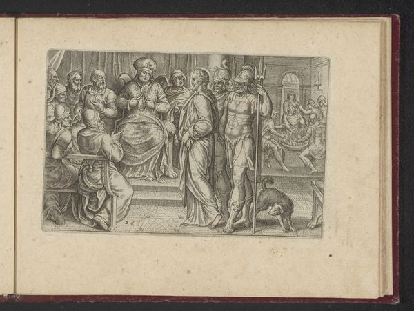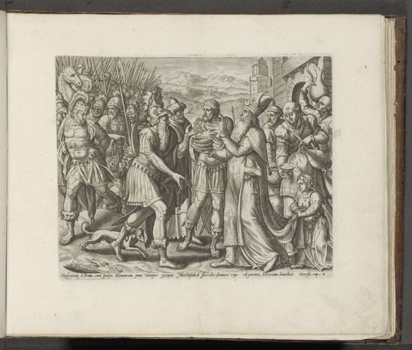 Editor: This is Philips Galle’s "Ontmoeting met Veronica tijdens de kruisdraging," made in 1573. It's an engraving, so a print, depicting a scene from the Passion of Christ. The linear detail is incredible, but I'm struck by how brutal and almost industrial the whole scene feels. What do you see in it? Curator: I see an intentional rendering of suffering, not just in Christ, but in the materials used to depict the scene. Galle, through the very act of engraving – a laborious, repetitive process – echoes the physical burdens faced by those in the story and experienced by those in Early Modern society, the intended audience, performing repetitive labor. The emphasis is on process, on the sheer physical effort required to produce both the print and, allegorically, the labor of the cross. Do you think this connects to social realities of the 16th century? Editor: Absolutely! Thinking about the economics of printmaking, it allowed wider distribution of these religious narratives, almost like mass production for spiritual consumption. It changes the dynamic, right? Curator: Exactly! The accessibility afforded by printmaking challenges traditional notions of high art versus craft, blurring the lines and impacting who consumes religious imagery. How does this context change your reading of the print? Editor: I hadn't considered how the material and process mirror the socio-economic structures. The suffering isn't just performative; it's inherent in the production itself, connecting the religious narrative to everyday life and commerce. Curator: Precisely. We begin to consider the act of consuming religious imagery as participation in that labor economy. Editor: This engraving then becomes a material testament to more than just faith – it's about labour, materiality and even early capitalism. I appreciate the way this focus reshapes the narrative. Curator: And it pushes us to consider who benefited from this 'spiritual consumption' and the very real networks that enabled this production. A print is more than an image; it's a material product within a web of social relationships.