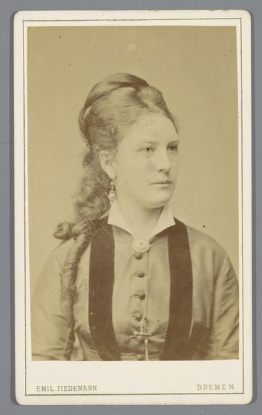 Curator: A melancholic air pervades this portrait. The gelatin-silver print, titled "Portret van een onbekende vrouw" and created sometime between 1891 and 1917, is a poignant capture of a woman shrouded in anonymity. Editor: The oval framing isolates her. I notice the tonal range, how it emphasizes her direct, almost challenging gaze, drawing us in. The texture of the ruffled dress contrasts sharply with the smoothness of her face. Curator: That dress, that crisp white collar…It situates her in a precise socio-economic bracket, doesn't it? Yet her name is absent, lost to the patriarchal archive, reflective of women’s frequent erasure in historical narratives. We are left to speculate about her desires, ambitions… Editor: The semiotics of studio photography in this period dictate a certain stillness, an idealised representation. Yet, there’s a dynamic asymmetry. Her hair is swept back, revealing one ear and directing us to one side, an unfinished or unseen narrative element. Curator: Exactly! Her steady gaze confronts us with this inherent contradiction – a manufactured image that hints at hidden complexities, making it fertile ground for exploring female agency within societal constraints. Her gaze demands acknowledgement. Editor: Looking at this I see that in capturing a human subject so expertly within the technical bounds, this highlights a masterful formal structure that remains visually impactful despite the absence of contextual details. It is quite compelling. Curator: True. While the formal choices create aesthetic appeal, that inherent "lack" urges me to delve deeper into the woman's context— to reclaim her identity and disrupt assumptions. Editor: A fine interplay between visual dynamics and historical undercurrents, indeed. Curator: Ultimately, her anonymity prompts important reflections on whose stories are prioritized in our collective memory.
