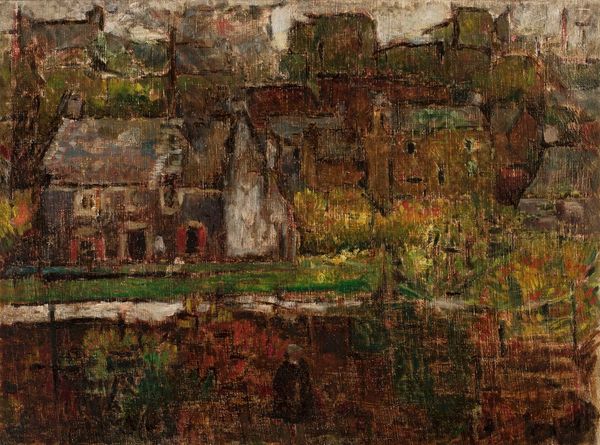 Curator: Here we have Egon Schiele's "Single Houses," a 1915 oil painting currently residing in a private collection. Editor: My initial thought? It feels like the houses are huddled together for warmth, all skewed angles and watchful windows. Kind of lonely, you know? Curator: The skewed angles are a crucial element. Notice how Schiele abandons traditional perspective, creating a sense of unease and instability. The formal construction is very much in line with Expressionist aesthetics. Editor: Unease, yes, precisely. But also a sort of vibrant decay, like these buildings have secrets etched into their walls. That rusty red facade on one of them… what’s that about? Curator: That’s a brilliant observation! Color is so important here. Schiele uses color to emphasize the emotional qualities of the buildings, giving them a unique sense of character, or maybe a better word here is identity. Notice also the compositional organization. Editor: Okay, unpack that. Identity? I’m with you. They are like characters in a play. It also reminds me of his portraits; they always feel so raw. It’s like he's painting their souls. Curator: Exactly. He transposes the psychological intensity of his portraiture onto these buildings. The brushstrokes, too, contribute; jagged and almost violently applied, especially in the rendering of the sky. Editor: Yeah, that sky looks like a nervous breakdown waiting to happen. But in a beautiful way, obviously! It really adds to this overall sense of tension and drama, don't you think? Curator: Most definitely. Through Schiele's singular vision, these structures transform from mere dwellings into emotional landscapes that challenge our perceptions. Editor: I'll say. Makes you wonder what stories those houses could tell, if they could only speak, maybe in harsh angles and rusty tones? What do you think?