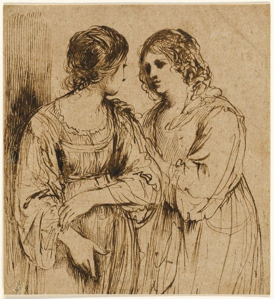 Philipp Rumpf made this drawing of two girls whispering sometime in the 19th century, using pencil or charcoal on paper. The soft, powdery quality of the medium lends itself well to capturing a fleeting moment. Rumpf's lines are quick and confident, sketching out the forms of the girls with an economy of detail. The paper itself, a warm grey tone, serves as a middle ground, allowing the artist to build up shadows and highlights with subtle gradations. Consider the social context: drawing was a valued skill in the 19th century, a mark of education and refinement. For an artist like Rumpf, it was a fundamental tool, used to record observations and develop ideas for larger compositions. But beyond its practical function, this drawing also offers a glimpse into a private world, a moment of intimacy shared between two young friends. By focusing on the materiality and making of this artwork, we can appreciate not only its aesthetic qualities but also its cultural significance, challenging the idea that craft is somehow separate from fine art.