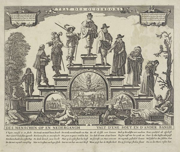 "De trap des ouderdoms," or "The Staircase of Old Age," was created by Erven de Weduwe Jacobus van Egmont, and is currently held in the Rijksmuseum. The print presents life as a series of stages, each represented by figures on a staircase, embodying a meditation on aging and mortality. The image is deeply embedded in the historical and cultural context of the Dutch Golden Age, a time marked by both prosperity and a heightened awareness of life's transience. Each step reveals a different phase of life, from youth to old age. The progression is steep, signifying the challenges and decline associated with growing older. Gender roles are subtly present, with men depicted in positions of authority, while women are often paired, reflecting the social norms of the time. The staircase leads ultimately to death, a stark reminder of life's finite nature. It’s a meditation on time, on what is gained and lost. The emotional power of this work lies in its unvarnished portrayal of the life cycle, inviting us to confront our own mortality.