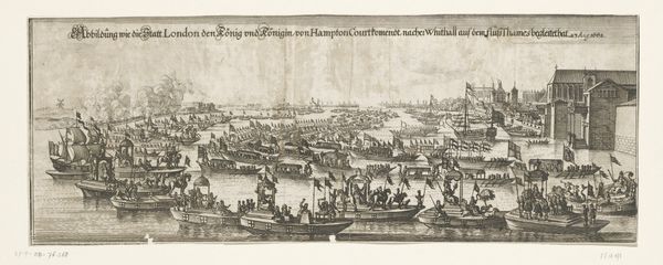 This print, made by Matthäus Merian II, commemorates Catherine of Braganza’s departure to England in 1662. It's an engraving, a process involving meticulous labor. The artist would have used a sharp tool called a burin to incise lines into a metal plate, likely copper. Ink is then applied to the plate, pushed into the engraved lines, and the surface is wiped clean. Finally, the plate is pressed onto paper, transferring the image. This method allowed for mass production, fitting for the subject matter. Consider the great ships depicted, symbols of global trade and colonial power. The print aestheticizes this activity, but also speaks to the vast amounts of human labor that fueled it. From the sailors manning the fleet to those who built the ships, this image quietly acknowledges the intense social stratification of the time. The fine lines of the engraving lend a sense of order and control to the scene, which belies the messy realities of international trade. By understanding the print’s making, we can better appreciate its complex relationship to labor, politics, and consumption.
