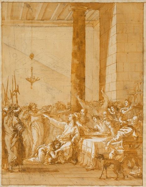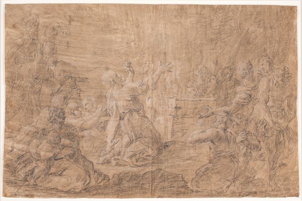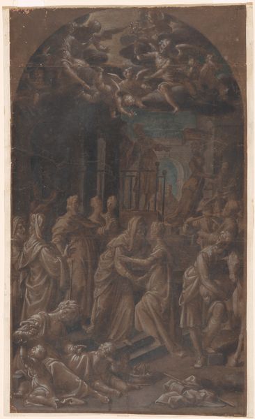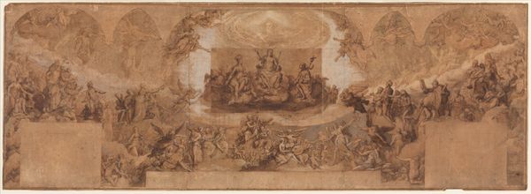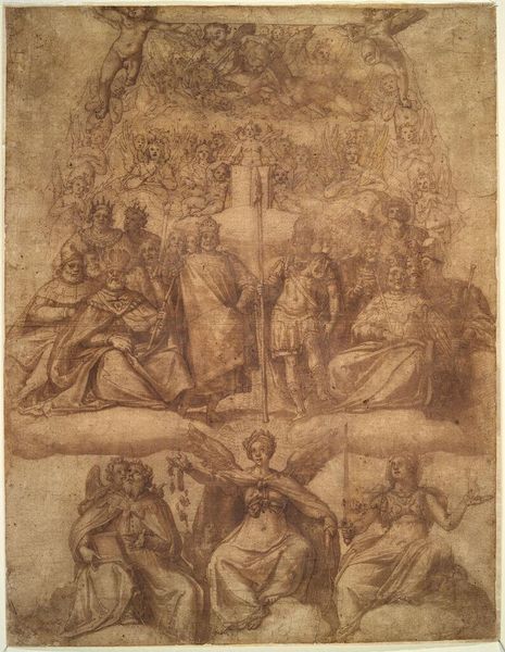 Curator: Pierre-Paul Prud'hon's drawing, "The Realm of Immortality," presents a heavenly assembly in sepia tones. Editor: It looks like an underdrawing, raw and full of potential. The material condition seems… fragile, almost like a forgotten relic. Curator: Note the formal structure: the semi-circular arrangement of figures, guiding the eye toward a central, elevated figure. The composition is classically inspired. Editor: But the social underpinnings intrigue me. Was this intended for reproduction? The earth-toned materials suggest a study, perhaps laboriously rendered for a larger project. Curator: Its lack of clear dating suggests a preparatory study, focusing on the linear relationships and spatial arrangements. A structured approach indeed! Editor: It really makes you consider the artist’s labor and the object’s journey to this museum. A lot to think about for such a small thing.