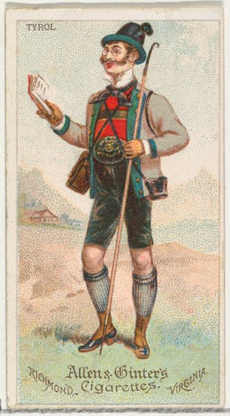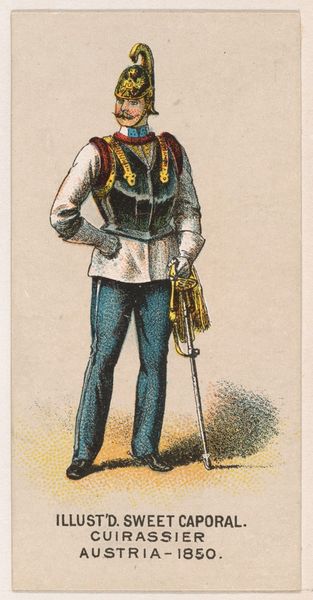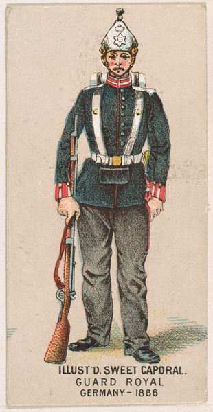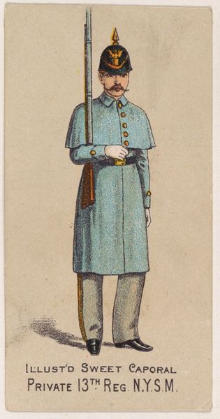 Editor: This is “Mountain Artillery, Spain, 1853,” a lithograph from 1888, by Kinney Brothers Tobacco Company. The detail is incredible for what's essentially an advertisement! It depicts a lone soldier, walking off into the sunset – well, maybe. There's something almost melancholy about him. What do you see in this piece? Curator: Melancholy, you say? I see a soldier geared for anything – perhaps burdened. It is as if he's carrying the weight of not only his equipment but of the very idea of "Spain, 1853". Don't you find it intriguing how something meant to entice people to buy cigarettes also unintentionally captures this subtle historical tension? I feel a bit like I've just stumbled into someone's private daydream of empire and ash. What does that say about the moment in history it depicts? Editor: So it’s more complex than a simple promotion? The figure definitely looks very serious. All business, no joy. Curator: Absolutely! Consider that period. The echoes of Romanticism, the looming specter of industrial warfare... even on this tiny stage, it becomes visible. It's like peeking into a collective unconscious, don't you think? Maybe the tobacco company stumbled into portraying that complexity by accident. And aren't those the most fascinating discoveries sometimes? Editor: I hadn't thought of it that way at all. Now I see it differently! This isn’t just an advertisement; it’s a little window into another world and time, full of complexities. Curator: Precisely. And that, my friend, is why art – even commercial art – never ceases to surprise and provoke us. We are forever trying to see ourselves.