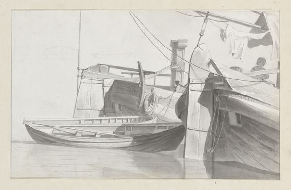 Editor: So this is "Schepen in een kanaal," or "Boats in a Canal," painted in 1918 by Maurice Guilbert, using watercolors. The overlapping, translucent forms create a lovely sense of depth, and the composition really highlights the contrast between the dark hulls in the foreground and the lighter masts receding into the distance. What strikes you first about it? Curator: Immediately, I’m drawn to the artist's manipulation of color and form to establish spatial relationships. Notice how Guilbert uses muted, almost pastel shades to suggest distance, contrasting this with the bolder, darker tones to delineate the boats in the immediate foreground. The linear quality achieved through watercolor is critical here. How do these lines define or even defy form? Editor: I see what you mean! It's like he's using color and line weight almost interchangeably to describe the shapes. The masts are particularly interesting - the thin lines against the blurred background suggest both presence and absence. Curator: Precisely. It prompts one to contemplate how these visual elements—the chromatic scale, the stark lines of the masts, the layering of washes—contribute to a sense of depth without relying on traditional perspectival techniques. Where do you feel your eye is drawn within the composition? Editor: Probably to the left, to the large dark shape; it dominates the composition and anchors my gaze. Curator: Yes, that large mass functions almost as a counterweight to the open sky and distant vessels. That counterweight serves a crucial function of pictorial balance. Editor: That's fascinating; I hadn’t considered the importance of the "weight" in the composition. I learned a lot, thank you. Curator: Indeed, this painting beautifully shows the interaction of form and depth to produce an engaging image, using line and layering as crucial elements.
