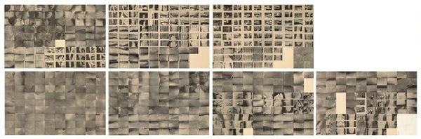 Curator: Upon initial viewing, I'm struck by the drawing’s enigmatic and somewhat brooding character. Editor: That's interesting. The graphite medium lends a starkness, doesn't it? We are looking at "Lights," a 1965 work by Tihamer Gyarmathy. It presents a fascinating study in geometric abstraction. Curator: Indeed. The repetition of lines and blocks immediately recalls architectural structures, perhaps even circuitry. The formal structure appears almost obsessive in its precision. I wonder about the intended reading of "lights." Is it ironic? Is it meant to denote illumination of the technological age? Editor: Perhaps it refers not only to physical illumination but also to the cognitive light shed by advancements of the mid-20th century? I'm particularly interested in how Gyarmathy physically achieved this image, using graphite in layers, to almost conjure light and shadow across the surface of the paper. Consider also the labor invested in meticulously creating such intricate designs with limited means. It feels like both an embrace and an indictment of mechanization. Curator: Certainly, one can decode elements within its visual vocabulary using structuralist methodologies. Those dark squares, for instance, interrupt the uniformity, introducing focal points which complicate any singular reading of 'light' as mere enlightenment. Their shadowy character seems to trouble this assumption, as if indicating potential areas of blockage or points of control in this imagined construct. Editor: Agreed, the tactile impression of the graphite—its potential smudging and layering—serves not just to render forms but conveys, equally, information related directly back the hand of the artist, imbuing what initially seems detached in fact connects deeply to the practice. In the end, despite Gyarmathy's seemingly rigid abstraction, we are still provided access back the very act of production, no matter how subtle! Curator: Precisely. The piece rewards prolonged consideration of its underlying formal dynamics. Editor: It provokes a reconsideration of simple classifications separating conception, materials, and creative output as singular occurrences; here we witness something simultaneously industrial yet handcrafted.