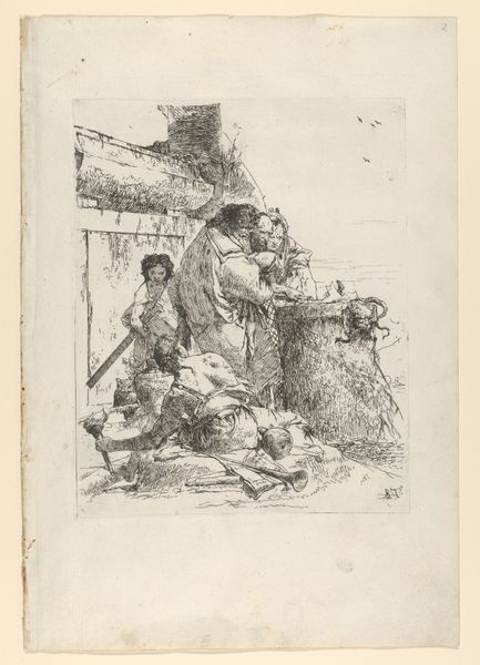 Editor: This etching, "Six people watching a snake, from the Scherzi", by Giovanni Battista Tiepolo, made sometime between 1738 and 1755, has a rather ominous feel. What do you see in this piece beyond the initial presentation? Curator: It's compelling, isn’t it? Beyond the surface narrative, consider the dynamics of power at play. The snake, a symbol often laden with complex meanings ranging from temptation to healing, is here being observed, arguably policed, by a group of figures. Think about who gets to define what is dangerous, what is acceptable. Editor: That’s interesting. It makes me consider who these figures represent. Curator: Precisely! Are they arbiters of morality, colonial observers documenting and judging the “other,” or something else entirely? Notice their diverse expressions, their attire, their positioning. How might contemporary postcolonial theory shed light on this scene? Do we see a parallel between the snake's potential threat and the historically marginalized being surveilled and controlled? Editor: It really pushes you to think beyond the immediate imagery and towards broader social implications. It feels more relevant now, considering contemporary concerns. Curator: Yes, because it compels us to question the power structures, even in seemingly innocuous scenes. And consider the “Scherzi” series itself – Tiepolo creating 'jokes'. What commentary is he offering on the society of his time, the "jokes" we play on each other? Art, at its most potent, holds a mirror to society, then and now. What did you take away from that analysis? Editor: How important it is to view even historical works through a lens that recognizes the continuing impact of power dynamics on our understanding and appreciation of art. Thanks!