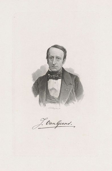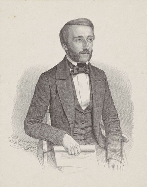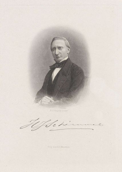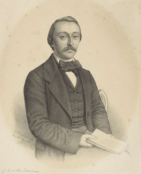 Editor: This is Dirk Jurriaan Sluyter's "Portrait of Hendrik Jan Schimmel," created in 1861. It’s a graphite drawing and very precise. The subject seems quite serious and stately. What do you see in this piece? Curator: Observe the rigorous linear quality that defines Sluyter’s work. The network of hatch marks and cross-hatching models the form, building a detailed representation of Schimmel’s features and clothing. Do you notice how the subtle gradations in tone create depth and volume? Editor: Yes, the shading is really impressive, especially around the face. It almost looks like a photograph, but softer. I also notice how minimal the background is. Curator: Precisely. The composition is elegantly spare, directing our attention to the meticulous rendering of the subject. Sluyter skillfully uses light and shadow to sculpt Schimmel's face, capturing a sense of three-dimensionality. Is it possible that the tonal range itself provides an avenue for conveying depth in personality? Editor: I think so! Focusing solely on the visual elements really does highlight how much detail and depth can be achieved. Curator: Indeed. By closely examining these formal aspects, we gain a greater appreciation for Sluyter's mastery of graphite as a medium and his ability to convey character through line and tone alone. Editor: Thanks for pointing that out. I learned to pay more attention to form and technique when viewing a work of art.
