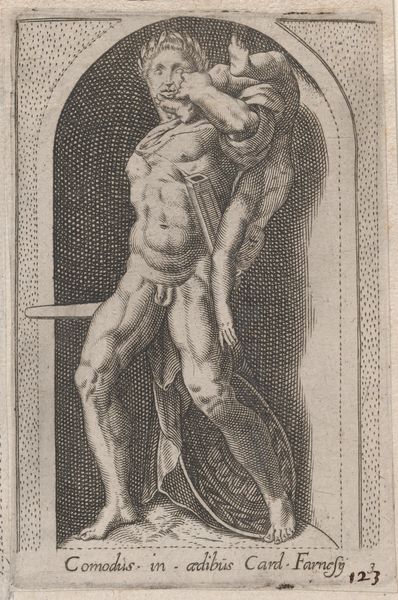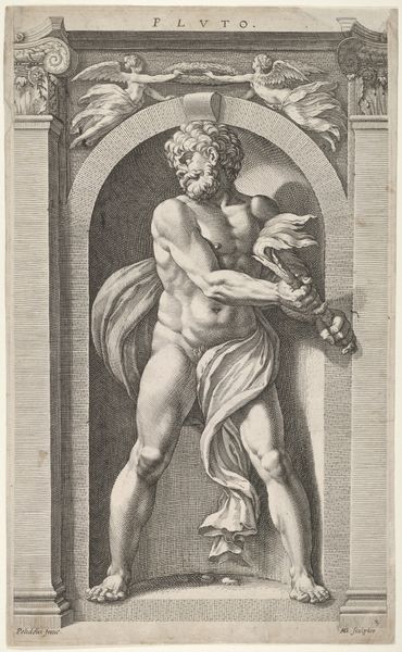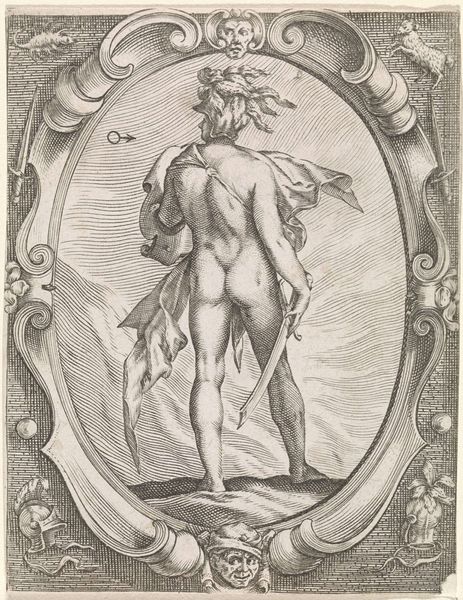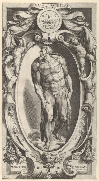 This engraving, after Michelangelo’s fresco in the Sistine Chapel, was made by Cherubino Alberti. It depicts a soul rising to heaven, framed by an ornate oval border. The figure's muscular back is powerfully rendered, as it twists upwards from a cloud. Alberti meticulously translates Michelangelo's painterly style into the graphic language of engraving. Notice how the dense, parallel lines create tonal gradations, giving volume to the body and a sense of dynamism to the upward movement. The frame is adorned with cherubs and decorative elements. The composition is a study in contrasts: the organic, fluid rendering of the human form set against the rigid geometry of the frame. This contrast serves to highlight the tension between earthly existence and spiritual transcendence. It encapsulates the Mannerist aesthetic, characterized by its exaggeration and distortion of classical ideals. Through line and form, Alberti captures not just an image, but an idea about the body's potential to exceed its earthly bounds.