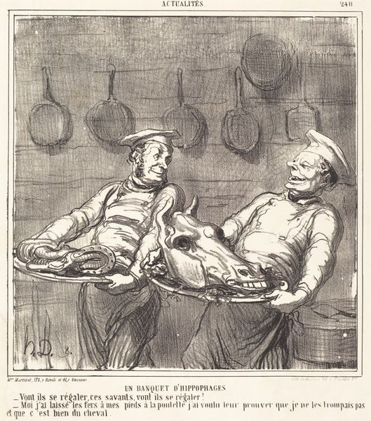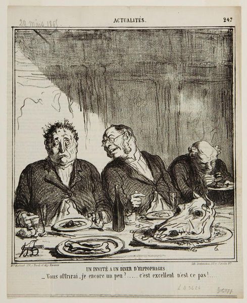 Honoré Daumier's lithograph presents us with a macabre dinner scene of horse eaters, captured with biting satire. The dominant symbol here is, of course, the severed horse head served as the main course, evoking ancient sacrificial rites and primal consumption. This act of consuming a horse's head carries echoes of archaic rituals, where animals were sacrificed and consumed to absorb their strength and vitality. We can trace similar motifs in various cultural practices, from ancient Greek animal sacrifices to shamanistic rituals in Siberia, where the consumption of animal parts was believed to transfer the animal's spirit. Over time, this evolved into symbolic gestures in art and literature, often representing power, virility, or a connection to the natural world. Daumier exploits the grotesque imagery to critique societal norms and human behavior, engaging viewers on a subconscious level through the repulsive yet captivating depiction of this feast. The horse head, once a symbol of nobility, is reduced to mere food, questioning the values of the modern world. Its cyclical journey through history reveals a fascinating interplay between tradition and transformation, a constant negotiation between the sacred and the profane.