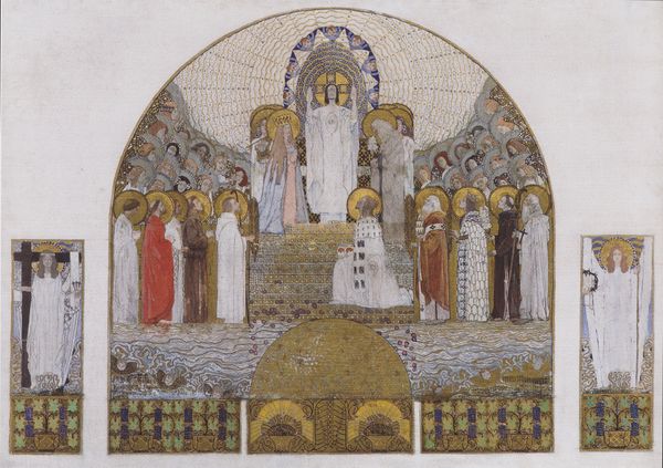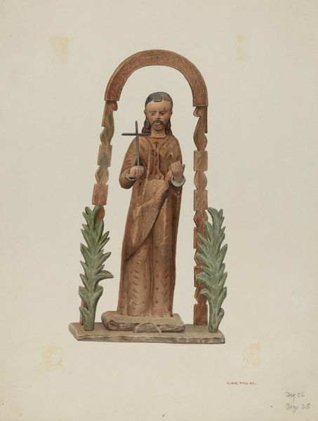 Curator: Standing before us is "Statue of Santo (probably St. Dominic)", a 1941 watercolor by Juanita Donahoo. Editor: It’s surprisingly earthy. The watercolor rendering almost mimics the texture of aged wood or stone, it gives a sort of solidity to something normally so ephemeral. Curator: Precisely. The choice of watercolor is interesting considering the subject; the Santo statues themselves are key components of religious expression in specific cultural contexts. Their materiality matters. Editor: Tell me more. How were they used, these Santo statues? Was there any power in the materials, or craftsmanship? Curator: Historically, these statues played a significant role in religious life, often serving as intermediaries between the divine and the everyday world. For local communities, acquiring or creating these statues reinforced communal bonds, becoming central to the religious culture. Editor: It does feel deeply devotional, particularly as Donahoo frames the figure. What catches my eye is the use of color. While some might expect brilliant, divine hues, there's this muted palette suggesting age and permanence. Is it commentary or pure observation? Curator: It's challenging to be definitive, but I'm inclined towards a societal observation, or influence. Academic art of this time served to reinforce ideals through specific historical contexts. Think of the way folk art gained increasing interest and a public platform at this time. Editor: But there's also a sense of immediacy. Watercolor lends itself to a quicker pace, doesn't it? More immediate than carving wood, for instance. It democratizes representation. Is the artist then attempting to democratize religious icons? Curator: Perhaps "democratize" isn't quite the word, but certainly to engage with its cultural presence beyond its sacred value, and perhaps to acknowledge its historical journey into modernity through its representation, wouldn't you agree? Editor: Yes, that strikes a better balance. Seeing Donahoo’s Santo this way is a thought-provoking experience. Thank you. Curator: It allows us to see a convergence of art, material culture, and historical narratives, offering layers of insight.