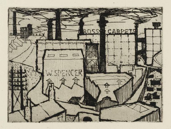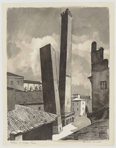Curator: Anthony Velonis's "Waterfront Whimsy," a graphite drawing created around 1936, offers a unique perspective on an urban scene. Editor: The first thing that strikes me is how off-kilter everything seems. The buildings tilt, the perspective is skewed... It feels almost dreamlike, or perhaps a touch unsettling. Curator: I think that distortion speaks to a broader concern about representation, particularly within urban environments of the time. Consider the context; the Depression was ongoing, affecting people's perceptions of stability and progress. Is Velonis reflecting social unease here? Editor: Absolutely. I mean, we see these diminutive figures trekking up what looks like a precarious walkway into the towering cityscape. It's almost like they're struggling against the weight and ambition of the modern metropolis itself. But why present the landscape in that disjointed style? Curator: Perhaps the piece presents an individual’s response to urbanisation as an uneven project? With progress having varied impacts, and the very fabric of cities undergoing monumental transformation. Also, there's an intentional choice of medium—graphite. Editor: Graphite allows for subtlety and depth, doesn’t it? The muted tones emphasize that somber, uncertain atmosphere that defines the time, but how do institutions like ours perpetuate these values through display choices? Curator: These questions must constantly inform the exhibit, so that “Waterfront Whimsy” isn’t only about Velonis, or New York of the 1930s, but what that visual story still provokes for us here and now. Editor: A poignant commentary on how urban landscapes continue to be arenas of hope and uncertainty, captured beautifully through this tilted reality. Thank you.