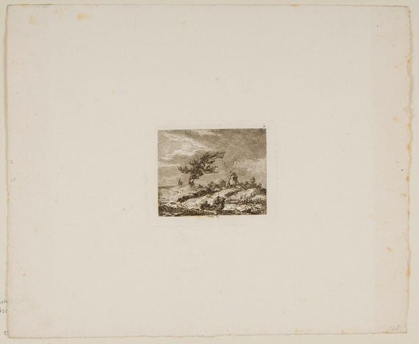 Reinier Vinkeles created this small engraving titled 'Tiger and Goat' sometime before his death in 1816. The image depicts a tiger seated beneath a tree, gazing up at a goat perched atop a rocky crag. Engravings like this one were popular in the 18th century, a time when European colonial powers were expanding their reach across the globe. Animals, particularly exotic ones, became symbols of the 'New World,' a concept that carried exotic and violent undertones. The 'Tiger and Goat' seems to evoke prevailing colonial narratives of dominance and vulnerability. Think about it – the tiger, a symbol of raw power, staring intently at the goat, a more docile and perhaps naive creature. It makes you wonder about the power dynamics at play and what the future holds for the goat. The work offers a glimpse into how the natural world was perceived and used to reflect human-centered power structures during an age of exploration and exploitation.