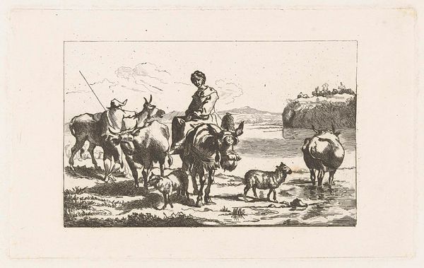 Editor: This print, "Jongen op een houten brug", from somewhere between 1646 and 1742, is by an anonymous artist and housed here at the Rijksmuseum. It's an etching showing a rural scene, and I'm really struck by the level of detail achieved just through lines. What stands out to you? Curator: Immediately, I’m drawn to consider the *process* of its making, the sheer labor involved in creating such detail through etching. Think about the materials themselves: the copper plate, the acid, the tools to meticulously carve each line. It highlights the artisanal production of art before industrialization. How does understanding its making influence your interpretation of its meaning? Editor: Well, thinking about the labor does make me consider the subjects in the print differently – the people working, the animals...it feels less romantic, somehow. More about the realities of their lives. Curator: Exactly! And what do you think that might suggest about the context in which it was made and for whom? Etchings like this were reproducible. Editor: Right, so perhaps available to a wider audience beyond the wealthy elite? It’s like a window into the everyday material conditions of Dutch society. Curator: Precisely! The subject matter focuses on labor, echoing larger socio-economic narratives within Dutch society. So it becomes more than just a pretty picture. We can see in the etching a social commentary on work and life, democratized by the printing process. How does that impact your perspective on the landscape? Editor: It makes me wonder about the environmental impact – was this landscape romanticized or representative of real working land? Also, the commodification of labor is evident with the animals and figures seemingly 'owned' or directed in the artwork, reflecting material constraints, economic dynamics...I now see a tension between romantic idealism and reality. Thanks for making me consider that. Curator: Indeed! Art is not divorced from life. We should never forget to explore what an artwork is, who made it, and also HOW.