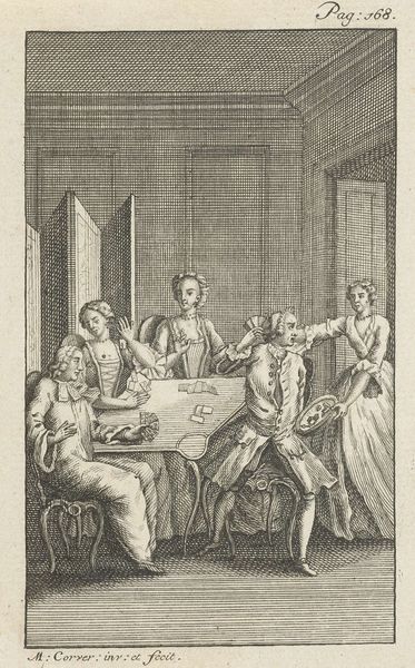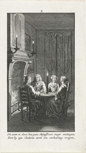 Curator: Let’s turn our attention to "Ontbinden van de kousenband," or "Untying the Garter," an engraving created sometime between 1740 and 1760 by Jan Caspar Philips. It’s currently part of the Rijksmuseum's collection. What strikes you about this scene? Editor: Well, immediately, I feel this…anticipation. A kind of hushed excitement, like the moment before a joke is told, or a secret shared. The candlelight really enhances that sense of clandestine play. Is someone about to be pranked or initiated into something? Curator: Perhaps both. Genre scenes like these became popular because they reflected evolving social mores—think of them as early reality shows reflecting and shaping perceptions of class, domesticity and power relations. Here we observe, not nobility, but probably merchant or professional classes and their leisure habits. Editor: Ah, I see it now—it does feel very staged, almost like actors posing. Which begs the question—is it titillating or satirical? Or can it be both? Is that garter a trophy, or is it merely symbolic, meant to tease about relationships and virtue in a safe way? I bet people then gossiped about engravings like these over their teacups and thought all sort of outrageous things. Curator: That is probably true. Remember that the circulation of images became quite widespread. These prints allowed social commentary to infiltrate new venues. Genre scenes especially permitted discussions on conduct under the guise of ‘art,’ although you’re quite right to assume they were interpreted in myriad, and perhaps unintended, ways. Consider the theatrical lighting here to heighten the drama. Editor: Absolutely. Look at how Philips manages to extract narrative richness and emotional resonance using stark lines in an entirely grayscale world. As an engraving, it is already working at multiple removes, documenting and dramatizing what was supposed to look ‘realistic’, though it certainly invites fictional interpretation and the opportunity to gossip around any detail in it! I think, if nothing else, this print confirms that even seemingly straightforward artworks contain multiple interpretive paths and possibilities. Curator: Yes, indeed, the layered, at times paradoxical nature of these types of art are revealed precisely through this close attention.