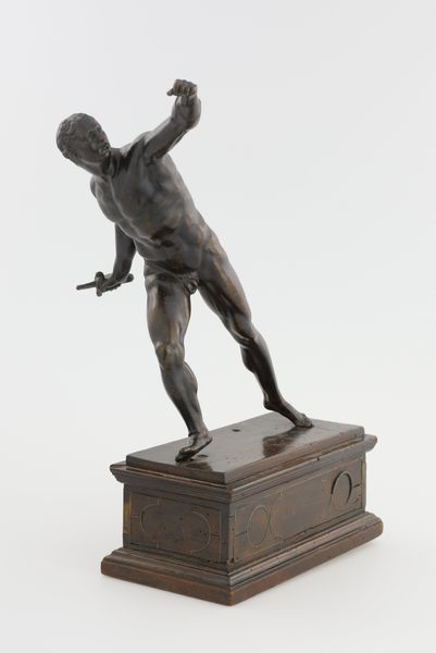 Curator: Here we have a small bronze sculpture entitled "Hercules," dating back to the early 16th century. The artist is, unfortunately, unknown. What are your initial thoughts? Editor: There's a contained ferocity to it. It’s the power of a legend, shrunken down and captured. You feel his potential strength rather than seeing it actively displayed. Curator: Absolutely. I think that restraint is interesting given how Hercules was deployed in visual propaganda. Powerful families loved aligning themselves with his myth. Can you see a symbolic purpose behind this figure? Editor: Oh, definitely. Hercules is a ready-made symbol for virtues desired by the elites of the time – strength, virtue, triumph over adversity. But it's not just about muscle; it's the wisdom and the labor to bring order to chaos. Who exactly, then, was the intended audience or patron for this small sculpture? Was it intended to reinforce their values or suggest they saw themselves reflected in him? Curator: It’s likely for private display. While the symbolism could align the owner with Herulean virtues, it's far more subtle. Thinkers would place similar symbolic meanings in gems, architecture or rituals. It works in much the same way; it's about encoding cultural values in tangible objects. In what other ways do you see it acting symbolically? Editor: Well, the material itself – bronze – speaks to permanence and value, setting Hercules apart, almost mythologizing him within the very artwork. Also, that downward gaze feels… weighted with a sort of introspective solemnity. It evokes thoughtfulness which subverts the classic heroic iconography. The hero must understand his deeds; a critical self-assessment that is equally, if not more, valuable than strength. Curator: An insightful perspective on how this statue portrays heroism. It avoids easy spectacle in favor of quiet potency. This Hercules has an interior life that, I agree, gives him enduring resonance. It certainly speaks to the skill of the anonymous artist. Editor: Indeed, that contemplative quality offers us a glimpse into how Renaissance audiences engaged with classical ideals – not merely imitating, but reflecting and interrogating. Thank you for guiding me through those insights. Curator: It was my pleasure to share that space of reflection with you, bringing a contemporary eye to these enduring stories is so important.