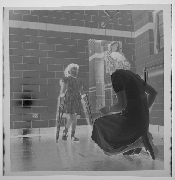 Editor: This intriguing photographic print by Lucian and Mary Brown shows a girl in a hat looking into a mirror. The inverted tones give it a ghostly quality. What stands out to you? Curator: The process is key. This is a vintage gelatin silver print, a specific materiality. How did their access to photographic materials shape the image? Was this a common technology readily available, or a more exclusive practice tied to a certain social class? Editor: That’s a great point. It makes me consider who had access to creating and consuming images like this at the time. Curator: Exactly! Considering the means of production reshapes our understanding and appreciation of the artwork itself.