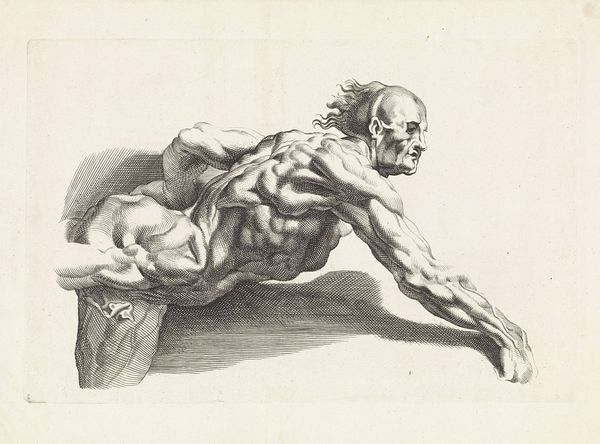 Curator: Good morning, I’d like to introduce Paulus Pontius's "Anatomische studie van een staande man," created sometime between 1616 and 1657. It’s currently held in the Rijksmuseum collection. Editor: Intriguing, it is raw and visceral. The pronounced musculature gives a somewhat tortured and distorted effect, despite its seeming dedication to realism. Curator: Pontius, a celebrated engraver from Antwerp, worked within a rich artistic milieu. Think of the pervasive influence of Rubens in anatomical studies—a clear nod to classical ideals viewed through the lens of Baroque drama and Catholic Counter-Reformation. Prints like this were hugely important as a method to disseminate such scientific explorations to artists and scholars across Europe. Editor: Agreed. The hatching and cross-hatching serve to accentuate volume and shadow, providing an illusion of depth that is quite sophisticated, especially considering this is just lines on paper. Look how the contrast highlights every sinew, lending an almost grotesque quality to the idealized male nude. Curator: Yes, its impact resonates deeply with the prevailing aesthetic of its era. Anatomy as a source of not only scientific knowledge but as a powerful reflection on human existence itself. The study hints at both strength and vulnerability. The posture suggests burden. Editor: The stark presentation undeniably emphasizes form over beauty, almost a surgical precision that speaks to objective investigation, far beyond mere portraiture. It's a dynamic display of line and contour creating both clarity and, dare I say, anxiety? Curator: Anxiety, precisely! Think about how anatomy theaters and medical advancements shaped public perception during this period. It all plays into the artwork’s lasting historical value and speaks to society's developing understanding of science, art, and the human condition. Editor: A valuable piece when considered alongside the history it reflects, yes, even through its emphasis on lines to construct the drama within. Thank you, fascinating. Curator: Thank you. A great note on which to conclude.