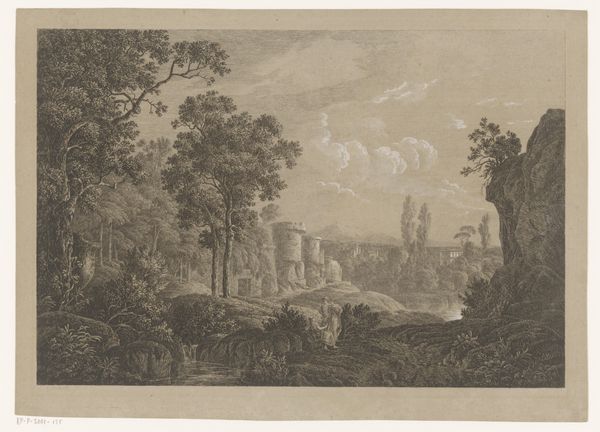 Nicolas Perelle created this print, Landscape with Antique Ruins, sometime in the second half of the 17th century. It reflects a broader cultural fascination with the classical past, particularly in France, where the establishment of institutions like the Académie Royale de Peinture et de Sculpture formalized artistic training and promoted classical ideals. The ruin becomes a poignant symbol of time's passage and prompts reflection on the transience of human achievement. The print uses visual codes, such as the ruined architecture and idealized landscape, which speak to the period's fascination with antiquity and its values. Figures populate the scene, serving as a reminder of humanity's continued presence amidst the decay. To truly understand this artwork, we need to consider its place within the social and institutional contexts of 17th-century France. Art historical scholarship, archival research, and an understanding of the period's aesthetic theories, can reveal the full richness of its meaning.