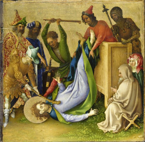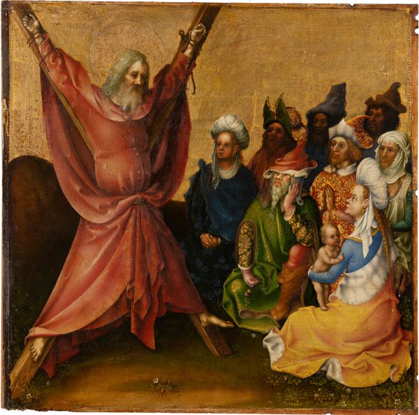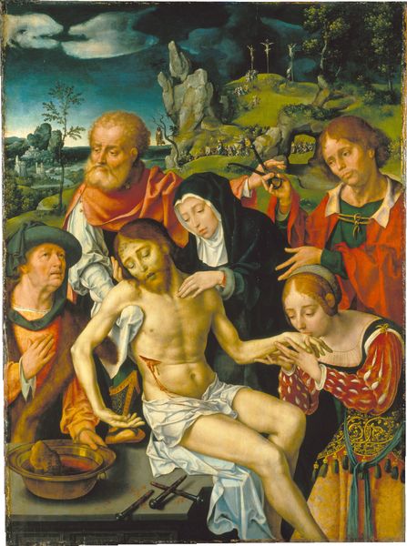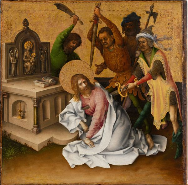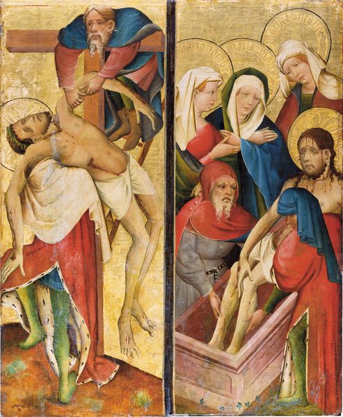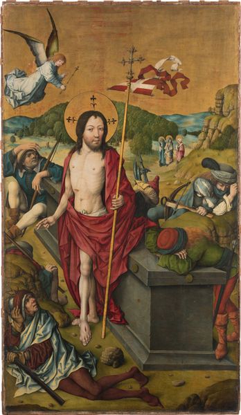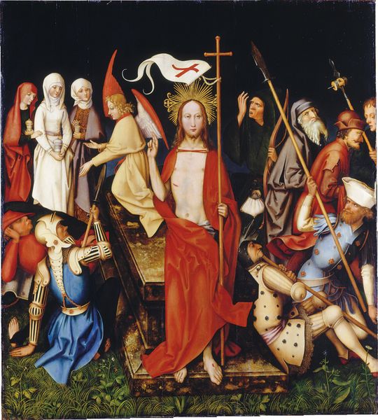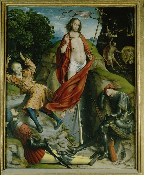 This painted panel depicts the Resurrection with the risen Christ emerging triumphant from his tomb. He holds a staff bearing a white flag with a red cross. This emblem symbolizes victory over death, a motif that has echoes in ancient Roman military standards, adapted to signify Christian triumph. Observe the guards, slumped in disarray, their weapons cast aside – a stark contrast to Christ’s serene and powerful stance. This echoes imagery of defeated figures found in classical art, repurposed here to emphasize the transformative power of resurrection. The symbol of the cross, once an instrument of torture, now signifies salvation. It recalls ancient symbols of sacrifice and renewal, reborn here with new meaning. This image taps into a collective memory, evoking deep emotional responses, where the agony of loss transforms into the joy of rebirth. The motifs within continue to evolve, resurfacing across time, each adaptation layering new meanings onto ancient foundations.