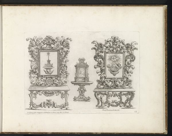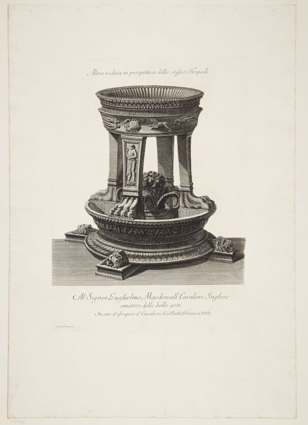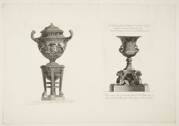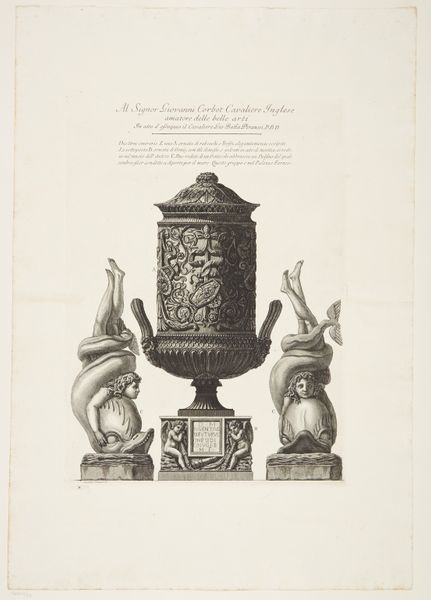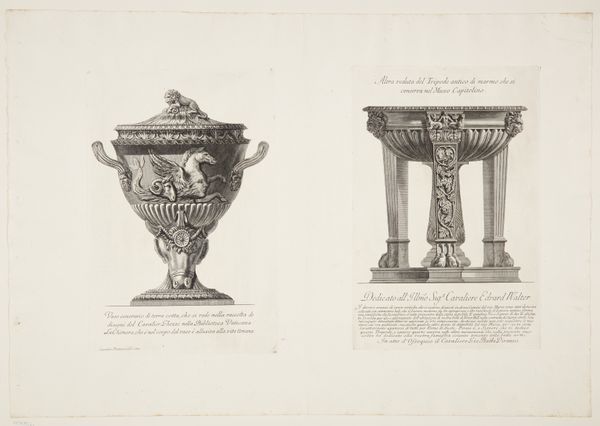 This print of a marble vase, flanked by griffons, and a group of women supporting a vase, was made by Giovanni Battista Piranesi in the 18th century. Piranesi was fascinated by Roman antiquities and his prints reflect a deep engagement with the material culture of the past. Here, the graphic medium is etching, a process involving the biting of lines into a metal plate with acid, which is then inked and printed. The incised lines mimic the texture and form of carved marble, emphasizing its inherent qualities. The vase, ornamented with griffons and foliage, and the figures of women, allude to classical forms. The amount of work involved in the production process, from quarrying the marble to carving the intricate details, speaks to the labor and skill invested in creating such objects. Piranesi's print invites us to consider the social context of these decorative objects and the cultural significance they held in their time, underscoring the dialogue between art, craft, and design.