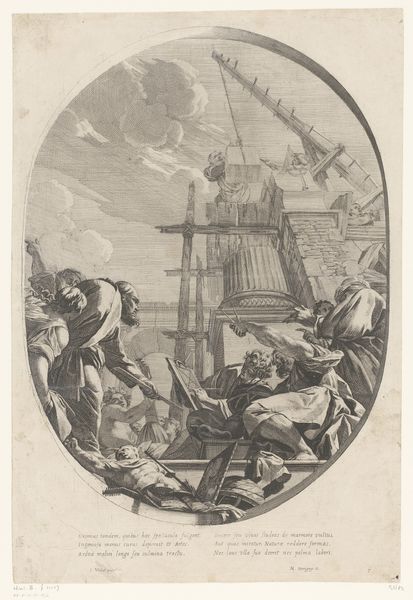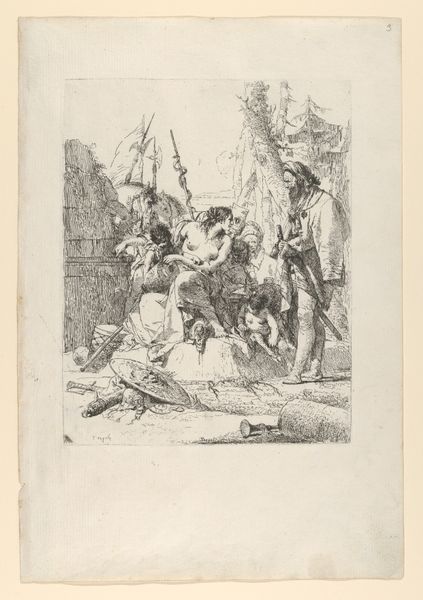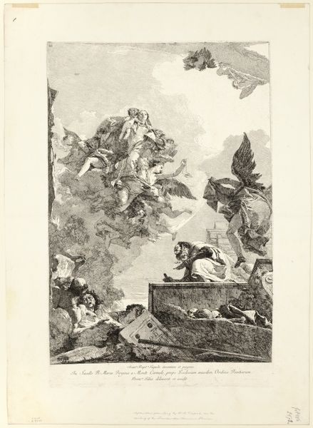 Curator: What a flurry of figures! It’s like a whole Baroque workshop crammed onto a single sheet. Editor: Indeed! We're looking at "Allegory of Painting", an engraving by Thomas Christian Winck, likely created between 1748 and 1797. Engraving being, of course, a printmaking technique using metal plates. Curator: It certainly captures the creative chaos! My eye is immediately drawn to the woman at the easel, paintbrush in hand. She looks completely absorbed. Is she supposed to represent Painting personified? Editor: Precisely. The image itself is an exploration of artistic representation and the act of creation, a theme quite common during that period. Winck plays with symbolism. You have all these muses and cherubs surrounding her, symbolizing inspiration. Curator: Muses aplenty, and one holding a little parasol, shielding… what, divine inspiration from sunburn? There’s a theatricality to it all. Editor: Ha! Well, consider that in the 18th century, academies played an increasingly vital role in standardizing art education and taste. Works like this reflected, but also reinforced, that institutional power dynamic, legitimizing certain classical subjects as artistically superior. Curator: But I get the sense Winck's having fun, poking at the establishment just a tiny bit. This isn't stuffy history painting. It feels more… lighthearted, playful, you know? Editor: Perhaps. Though, remember, prints like these circulated widely. This print offered people a glimpse into the "correct" way of approaching art, whether they intended to engage in creative processes or be an informed consumer. Curator: It's an odd dance, this balance between idealized image and something approaching the messiness of lived creation. It makes the artist feel so close and far away, both reverent and wryly, gently critical all at once. Editor: Art’s public role and institutional development certainly impact the production and consumption of engravings like this, the dialogue between commerce and reverence so tightly interlinked that a single definition seems reductive. Curator: Absolutely. It leaves me pondering how many other hidden narratives lie within its delicately etched lines. Editor: Indeed. It leaves me considering the forces that brought these figures into being and what those forces are saying now.