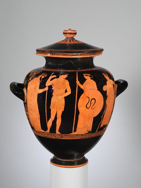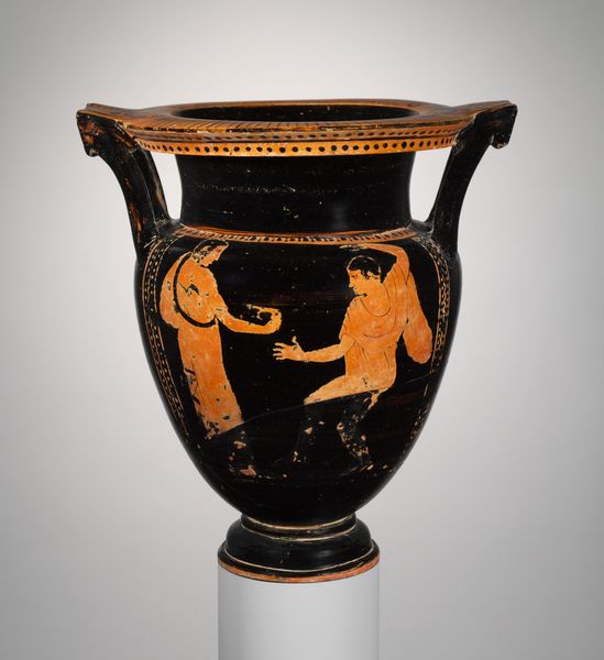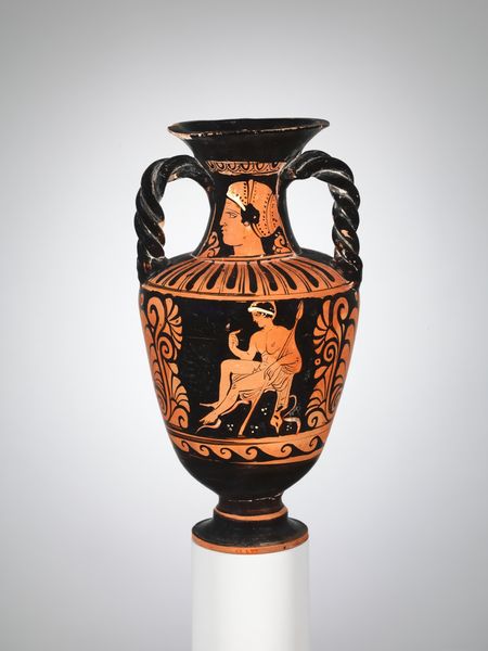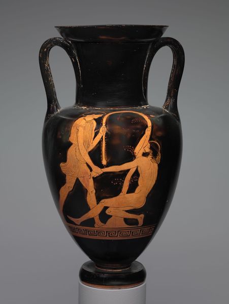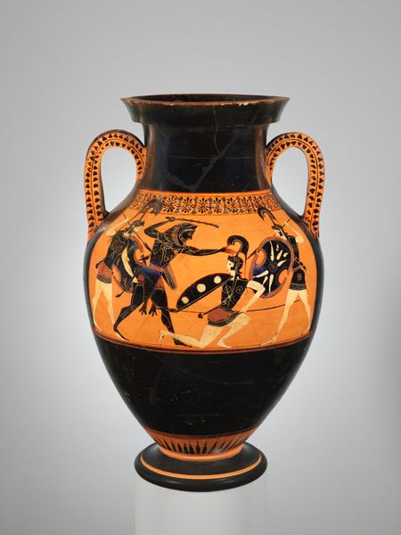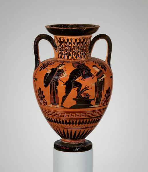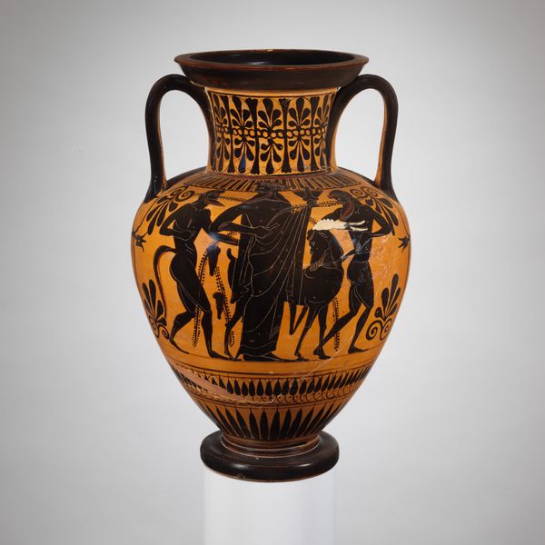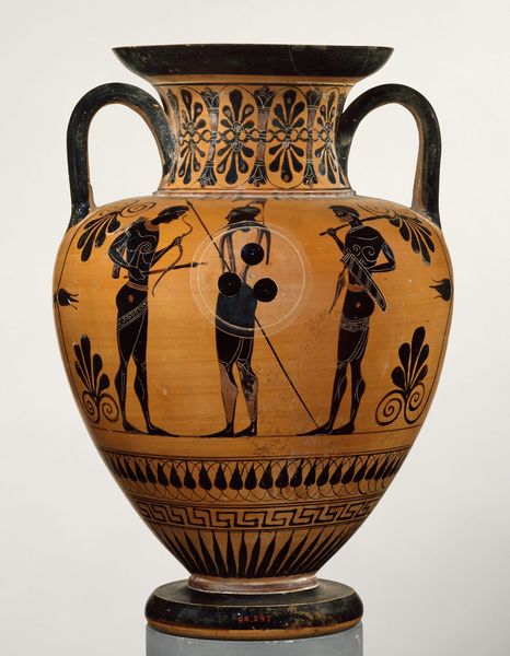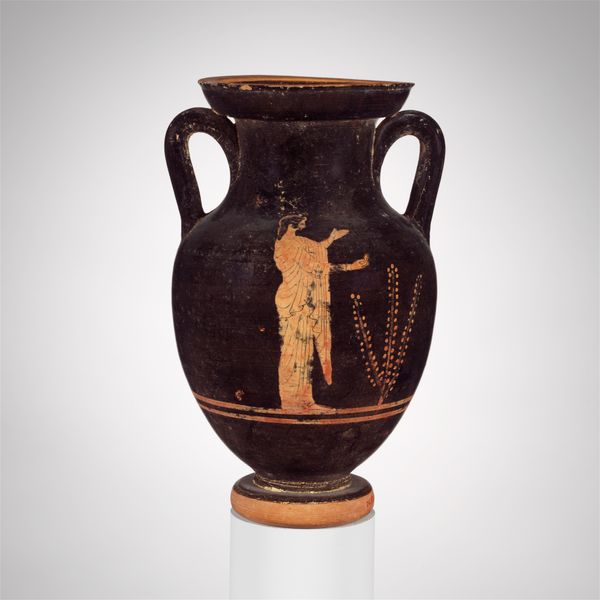 Editor: Here we have a terracotta amphora, a jar created around 499 BC by the Praxias Group. It's currently housed at the Metropolitan Museum of Art. The figure is so striking against the black backdrop. How do you interpret this work, especially considering its function and cultural context? Curator: Well, let's consider the socio-political climate of 5th century BC Athens. These amphorae weren't just decorative objects; they were integral to trade and storage. What does depicting a single male figure signify about the priorities or values being projected to the public? Editor: That's a great point. It's not just about artistry, it's also a statement, or even propaganda? Is this idealized athletic figure a reflection of cultural values around physical prowess and citizenship? Curator: Precisely. Athenian society celebrated the male athlete. Think about the Panathenaic Games; victors were often rewarded with amphorae filled with olive oil. Could this vessel be linked to such a context, reinforcing social hierarchies and aspirations through visual representation? Editor: It makes me wonder who the intended audience was. Was it for the elite or was this kind of imagery aimed at a wider segment of society? Curator: Excellent question! Consider where such vessels were found – in tombs, as prizes, in domestic settings? Distribution patterns inform us about who consumed and controlled these images. These amphorae served not just a practical purpose, but also a social and ideological one. Editor: So it’s more than just a jar, it's a multi-layered artifact reflecting social structures. That gives me a whole new perspective. Curator: Indeed. By exploring these angles, we reveal the intricate relationship between art, power, and everyday life in ancient Greece.