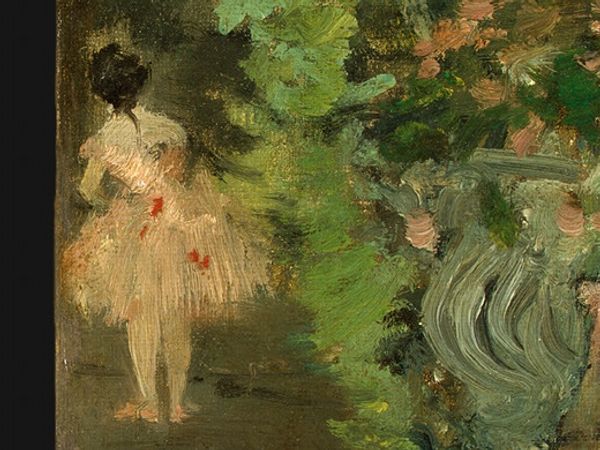 Curator: Victor Borisov-Musatov completed "Emerald Necklace" in 1904, employing gouache and watercolor. It currently resides in the Tretyakov Gallery here in Moscow. Editor: It's such a melancholic painting, isn’t it? The muted greens and the dreamy, almost faded quality create a sense of longing. The women seem lost in thought, and their elegant dresses add to this feeling of a bygone era. Curator: Absolutely. Musatov was deeply influenced by Symbolism, which is very evident here. It's not just a portrait or landscape but a reflection of mood and memory, resonating with the intellectual climate of the Russian Silver Age and the pervasive sense of historical crisis. Editor: There is an element of theatricality as well. Their stances, set against that soft, impressionistic, verdant backdrop makes me question the narratives the Russian aristocracy was willing to buy. Were they escaping the winds of change, cloaking in such depictions, while the country moved toward revolution? Curator: Precisely! The historical context is key. The aristocracy sought a nostalgic connection to the past, while revolutionary ideas fermented, reflecting Musatov’s deep immersion within contemporary political forces. These depictions contributed to creating identity within pre-revolution Russia. Editor: The hazy brushwork, the ethereal light…it distances the figures, elevating them from reality into the realm of romanticism and mythology. The material itself, this use of gouache, serves this symbolic dimension as it has a distinct visual texture that emphasizes its dream-like ambiance. Curator: Right, the material serves to highlight this symbolic, escapist nature. Musatov’s choice to depict the women in such soft focus also contributed to the themes prevalent among the Russian avant-garde in visualizing these themes. Editor: Reflecting on this piece, I see both an embrace of the past and a premonition of a new dawn. It is striking how the choice of materials contributes to an ambiance of fleeting, beautiful memories. Curator: Indeed. The piece encapsulates the shifting cultural tides of its time and reveals, if only indirectly, the socio-political currents that influenced Musatov. A true statement on society and history.