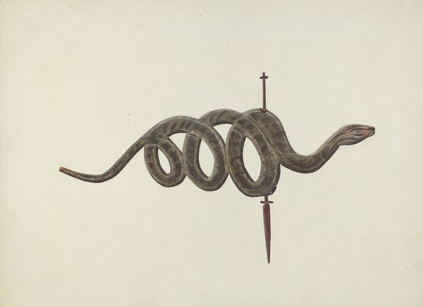Editor: This is Alexander Anderson’s "Rawhide Herder’s Whip," a watercolor drawing from 1940. It’s striking in its simplicity; a straightforward depiction, but so carefully rendered. What does this utilitarian object, displayed as art, tell us about the context of its time? Curator: That's an excellent starting point. Consider how the Dust Bowl and the Depression influenced artistic choices. Artists were grappling with representing everyday life, particularly labor. Displaying a whip—a tool of work, often associated with cattle driving—elevates a mundane object to a symbol of a particular cultural identity, particularly in the West. How do you see the formal qualities contributing to that message? Editor: The braiding is so carefully detailed. It almost feels celebratory, rather than documentary. Curator: Exactly! And think about the absence of the herder, the livestock, the landscape. It puts all the emphasis on the *object* itself. This raises interesting questions about how institutions shape our understanding of the "American West." Does this depiction glorify a certain lifestyle, or is it a more nuanced exploration of labor? Was this art produced under the WPA? Editor: That's something to look into. It definitely changes how you perceive it. The drawing appears deceptively simple, but holds complex cultural meaning about labor and life. Curator: Indeed. Understanding art as part of its historical fabric challenges us to think critically about representation and who controls the narrative.