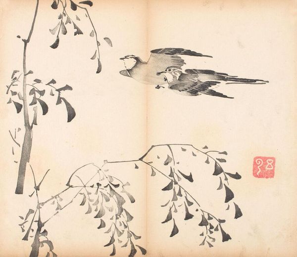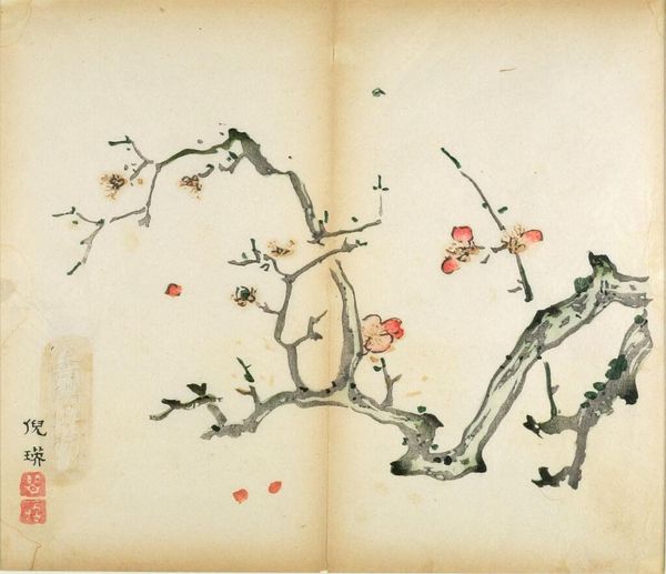 Editor: This is "Bird on a Flowering Branch," an illustration from the Ten Bamboo Studio Manual of Calligraphy and Painting, by Hu Zhengyan. The simple ink drawing gives a sense of delicacy. What can you tell me about it? Curator: This print, made with ink and color on paper, highlights the sophisticated woodblock printing process used in the Ten Bamboo Studio Manual. The layering of blocks to create tonal variations collapses the distinction between craft and art. Note how labor and material intersect in its creation. Editor: So, it's not just the image, but the *making* of the image that matters? Curator: Precisely! By understanding the means of production, we see how artistry could be democratized through printing. Editor: I never thought of it that way; it's interesting to consider the social implications of artistic production.
