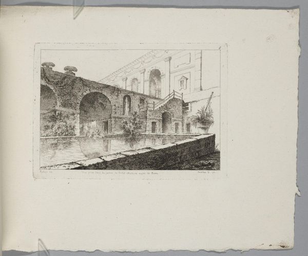 Editor: This is Henri Antoine Gaston de Gourcy's "Valens Aqueduct (Constantinople)," it's a small print with a lot of detail. I find the contrast between the ancient aqueduct and the modern buildings around it quite striking. What symbols do you see here? Curator: Well, the aqueduct itself, a Roman structure in Constantinople, speaks volumes. It’s a symbol of enduring power, but also of cultural layering – Roman engineering adapted and incorporated into Ottoman life. Do you notice how nature seems to be reclaiming it? Editor: Yes, the vegetation on top makes the aqueduct look softer somehow. Curator: Exactly! It blurs the line between human achievement and the relentless march of time. The aqueduct, originally designed to provide life-giving water, now stands as a backdrop to daily life, its original purpose somewhat obscured, becoming a symbol of memory itself. Editor: I hadn’t thought about it that way. It’s like the city holds its history in plain sight. Curator: Precisely. It makes you wonder about what other narratives are embedded within our everyday landscapes. Editor: This makes me appreciate how artworks create conversation between the past and present.