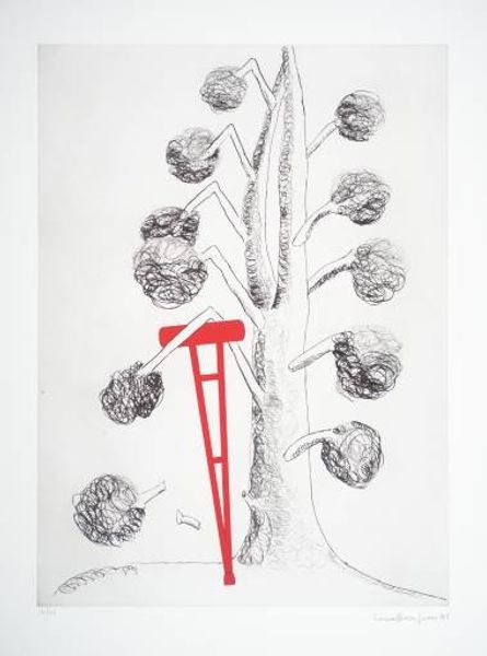 Louise Bourgeois made this print, Tree with Woman, using etching. It presents a tree with bulbous growths and a woman emerging from its trunk. Bourgeois's work often explored themes of childhood trauma, sexuality, and the body. The imagery here, combining a maternal, life-giving symbol like a tree, with a female figure, suggests a commentary on gender roles and the pressures of motherhood in the 20th century. Bourgeois was born in France and later moved to the United States. Her career developed during a time of significant social change, including evolving attitudes toward women’s rights, which she experienced first hand as a female artist struggling to gain recognition in a male-dominated art world. To understand Bourgeois’s work more fully, we can look to feminist art history and psychoanalytic theory. These interpretive frameworks provide tools for examining the personal and political dimensions of her art, revealing how individual experience intersects with broader social and cultural contexts.