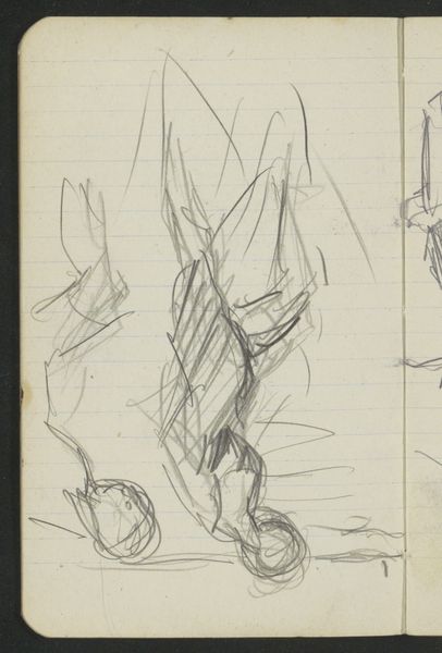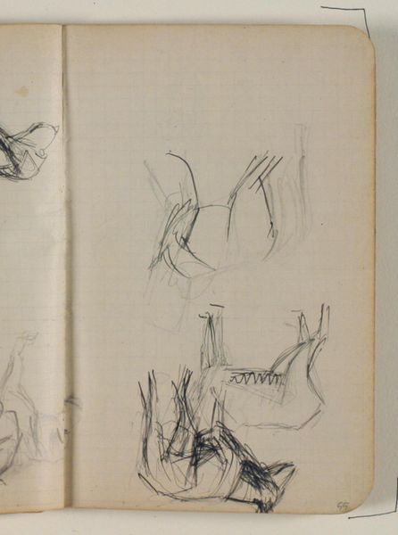 Editor: Here we have "Skitser af hunde," or "Sketches of Dogs," by Niels Larsen Stevns, created between 1905 and 1907. It's a pencil drawing on paper. I'm immediately struck by how energetic and almost frantic the lines are, really capturing movement. What catches your eye when you look at this drawing? Curator: The immediate impact derives from the stark contrast of line and the varying pressure of the pencil strokes. Observe how Stevns uses the density of marks to define form, particularly in the lower right grouping where we can see how the darkest area articulates what seems to be the mass of the animal. Consider the visual relationship between the density of marks and the emerging legibility of the subject matter. What sense of spatial relationship does that generate? Editor: It's interesting, because where the lines are thickest, it almost feels less clear, like the animal is dissolving back into the page. The thinner lines around it, the rapid sketches, are somehow more defined. It feels a bit contradictory. Curator: Precisely. This is a key to understanding the piece's formal complexity. Stevns isn't just representing dogs, but also exploring the potential of the medium itself. The visual interplay between the perceived clarity and the actual density of line complicates our understanding. How does this contrast affect the way you read the drawing as a whole? Editor: I guess it makes me think more about the process, the act of drawing. It's not about perfectly capturing a dog, but about exploring form and movement through the pencil. It feels raw and immediate. Curator: An astute observation. Indeed, the drawing reveals itself to be as much about the potential of the pencil and the paper as it is about representing the canine form. The stark simplicity encourages deeper reflection on artistic representation. Editor: This has made me see the drawing in a completely new way. It’s not just a sketch of dogs; it's a study of line, form, and the very act of creation. Curator: Agreed. The work becomes an act of interrogating representation and of being present in the act. A sophisticated investigation using simple means.