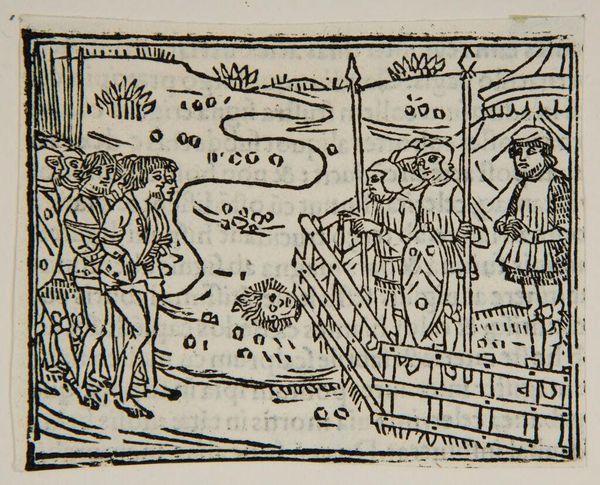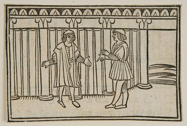 Curator: I’m immediately struck by the tension in this image; there’s a sense of unease despite the relatively simple composition. Editor: Indeed. This woodcut print, titled "Book II.27. Disssention between patritians and plebians; Ringleader of commons apprehended" depicts a scene of social unrest. Curator: The three figures, presumably the "Ringleader," appear to be in consultation, heads bowed. The artist uses the hats as markers of their status, connecting them visually. Editor: Absolutely, the attire signals a collective identity in opposition to the architecture behind them, signifying institutions of power. I find myself wondering how such images shaped public perception. Curator: The weight of visual symbols can't be overstated—they reinforce cultural narratives. Editor: Right, and in this case, that narrative involves power, class, and the ever-present potential for dissent. It's a timely reflection, still. Curator: A reminder that visual language is a potent tool for understanding society. Editor: And that even anonymous artworks have important stories to tell.