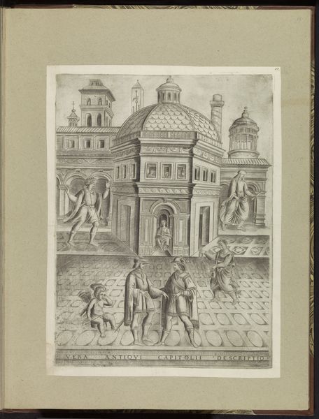 Curator: This is an intriguing print titled "Gebouwen op het oude Capitool te Rome," or "Buildings on the old Capitoline Hill in Rome." It’s attributed to an anonymous artist and believed to have been created sometime between 1595 and 1622. Editor: Immediately, I’m struck by how precisely the architecture is rendered. There’s a somewhat dreamlike quality despite the almost scientific precision of the linework. It’s a very static scene. Curator: I see it! There’s a stillness, yes, and a sense of architectural documentation happening here. But look at the figures placed within and around these Roman buildings – they’re like players on a stage, breathing life into what might otherwise feel like a cold, calculated study. I wonder if it's attempting to capture an idealized or imagined version of the city. Editor: And what of the idealized citizen? Do you notice how gender plays out? Women appear inside balconies while the central space below depicts only men at work or play; one could draw lines of connection between the architectural space of that society, the ways people relate to one another within it, and those lines of gender. Curator: Absolutely. These architectural forms, with their imposing columns and arches, project power and control, while that very constructed public space – its limitations and hierarchies – directly influences individual agency. Editor: The medium—engraving—itself has such interesting implications! In a sense, this technology would allow many people access to depictions of places they might never see otherwise. This allows for wide scale dissemination, especially along axes of empire and colonization, giving people further 'justifications' for domination in faraway places. Curator: I never thought about the reproduction of an image this way, I was too deep in considering how the artist had painstakingly rendered this imaginary Roman place to life. Thinking of its future proliferation, like many works, taints the pleasure of observing with its beauty and careful construction! Editor: It really asks us to reflect on what exactly that process of translating place involves – how it creates certain social relations while obscuring others. Curator: You know, examining this piece, and with your interpretations, the engraving transcends simply being a pretty picture for me. It has become a historical and cultural artifact that has its very own agency! Editor: Precisely. That shift in perspective – it’s what makes looking at historical artworks endlessly compelling.