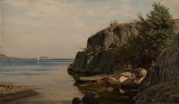John Frederick Kensett painted 'Near Newport Rhode Island' with oil on canvas. Dominating this vista is the stark rock formation, a timeless symbol of endurance. Rocks, as elemental forms, recur across cultures, from ancient fertility idols to the cornerstone of sacred buildings. The rock here evokes not only physical strength, but also the stoicism of nature itself, a silent witness to the passage of time. Consider the recurring motif of rocks across art history: Caspar David Friedrich's craggy cliffs symbolize the sublime power of nature. This element transcends mere representation, tapping into our collective subconscious. In Kensett's work, the rock, mirrored in the water, prompts introspection, inviting us to reflect on our place within the grand, enduring tapestry of existence. The symbolism around rocks has moved away from their significance as pagan symbol towards something more profound.