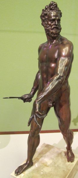Curator: Take a look at this bronze sculpture titled "Cacciatore Notturno", attributed to Giambologna. It depicts a figure poised mid-action. What's your immediate reaction? Editor: A dark urgency. The color of the bronze and the hunter's intense posture speak of an almost desperate, frantic energy. There’s a suppressed tension here that's palpable, though I can’t immediately identify its source. Curator: It’s quite interesting to consider how Giambologna engaged with the visual politics of the era through these pieces. This bronze works fits into the Mannerist movement. Notice the distorted proportions and dynamic twisting of the body. It breaks from High Renaissance ideals, expressing instead tension and drama. This corresponds to the artistic expression of anxiety and skepticism that developed from socio-political contexts. Editor: The hunting figure itself evokes layers of symbolism. The hunt as a pursuit, perhaps a relentless chase after knowledge, power, or even elusive spiritual ideals? The tool being held overhead is so unusual looking. Does the odd bulb at the end of the shaft signify something to you? Is this even something meant to cause deadly harm to prey? Curator: Some historians argue that it reflects an interest in antiquity, while others emphasize the courtly function of bronzes at that time, reflecting refined taste in that cultural setting. This sculpture seems almost made to invite analysis of cultural identity, prestige and aesthetic discernment. The piece prompts questions about whose taste and authority it catered to, as it was appreciated for its artistry and social status. Editor: Definitely, the act of the hunter also presents symbolic layers. Is he protecting or persecuting? Curator: A great point! Also what stories, morals and power are behind such characters. And for whom are these artistic narratives told? It is likely for private collector of means or some powerful political authority. This bronze acts not just as visual depiction but as symbolic claim about knowledge, mastery, control and, potentially, cultural identity and domination. Editor: So well articulated. This analysis definitely shifts how I view the sculpture! Suddenly its frantic energy seems purposeful, directed at expressing both aesthetic style and power. Thank you for shining some light on how bronze medium acted in this historical frame!